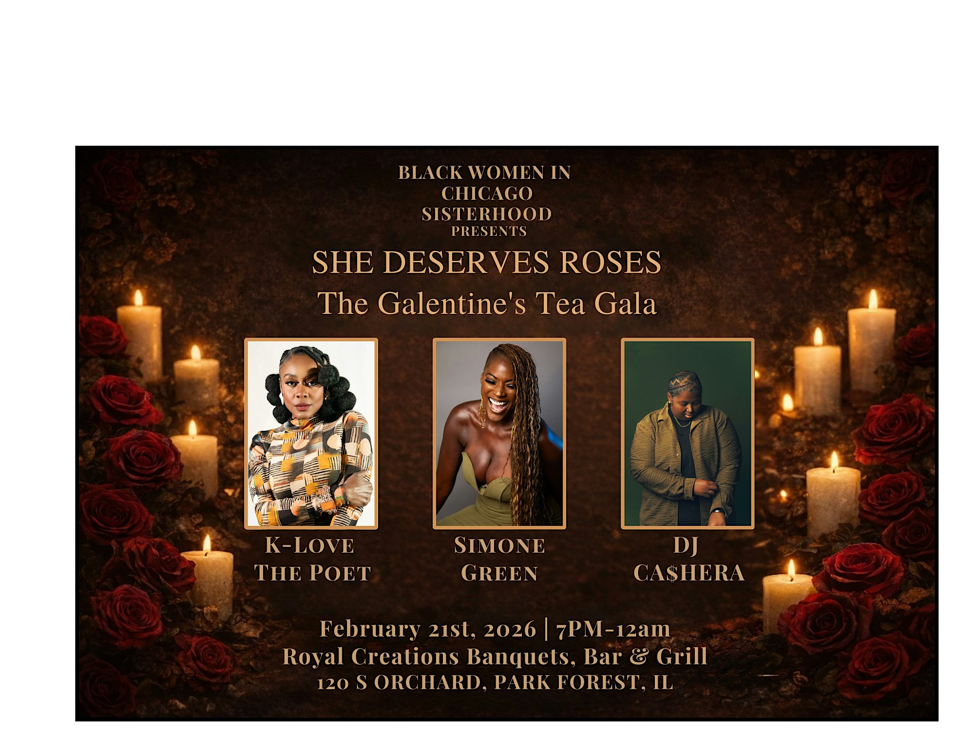 by admin12Feb She Deserves Roses: The Galentine’s Gala at Royal Creations Banquets, Bar & Grill – Park Forest, IL She Deserves Roses: The Galentine’s Gala at Royal Creations Banquets, Bar & Grill – Park Forest, IL 5 5 people viewed this event. A Galentine’s Gala celebrating sisterhood, love, and joy — featuring Simone Green, K-Love & DJ Ca$hera. Tickets-RSVP Link Date And Time Sunday, February 22nd, 2026 01:00 AM (PST) Venue Royal Creations Banquets, Bar & Grill Location 120 South Orchard Drive, Park Forest, IL 60466 Event Types Seasonal & Holiday Event Category Illinois Share With Friends Facebook Twitter Linkedin Xing Pinterest Share This Post: