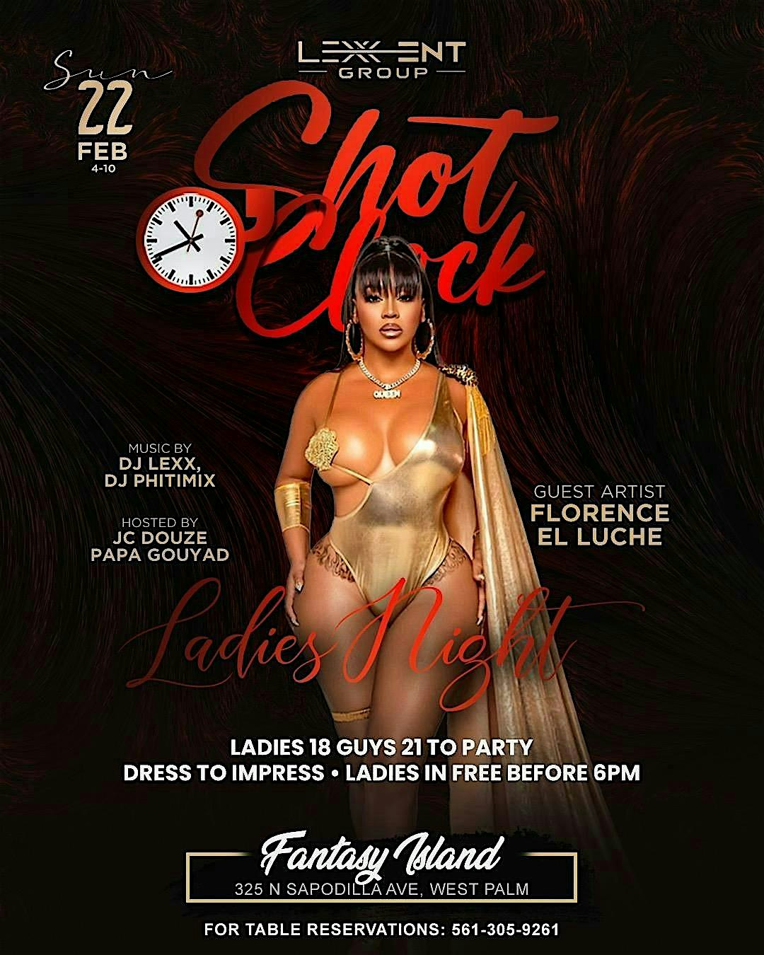 by admin13Feb SHOT O’CLOCK DAY-PARTY LADIES NIGHT FEAT. FLORENCE EL LUCHE at 325 N Sapodilla Ave – West Palm Beach, FL SHOT O’CLOCK DAY-PARTY LADIES NIGHT FEAT. FLORENCE EL LUCHE at 325 N Sapodilla Ave – West Palm Beach, FL 1 1 people viewed this event. SHOT O’CLOCK IS THE DAY PARTY IN SOUTH FLA WITH A BLEND OF KOMPA, R&B, AFROBEATS, RABODAY, DANCEHALL AND MORE. WE ALSO HAVE FULL KITCHEN Tickets-RSVP Link Date And Time Sunday, February 22nd, 2026 09:00 PM (PST) Venue 325 N Sapodilla Ave Location 325 North Sapodilla Avenue, West Palm Beach, FL 33401 Event Types MusicParty or Social Gathering Event Category Florida Share With Friends Facebook Twitter Linkedin Xing Pinterest Share This Post: