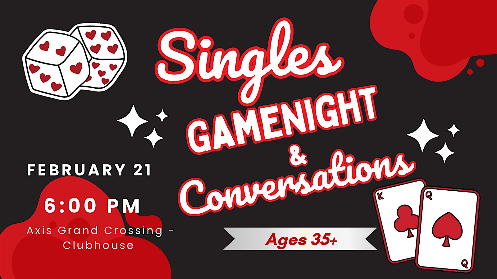 by admin12Feb Single Adults GameNight & Convos. at Axis Grand Crossing – Clubhouse – Grand Prairie, TX Single Adults GameNight & Convos. at Axis Grand Crossing – Clubhouse – Grand Prairie, TX 6 6 people viewed this event. Join a mature group of local singles 35+ for a fun, interactive evening filled with games and insightful dialogue and role-playing. Tickets-RSVP Link Date And Time Sunday, February 22nd, 2026 12:00 AM (PST) Venue Axis Grand Crossing - Clubhouse Location 1661 Forum Drive, Grand Prairie, TX 75052 Event Types Community & CultureParty or Social Gathering Event Category DallasTexas Share With Friends Facebook Twitter Linkedin Xing Pinterest Share This Post: