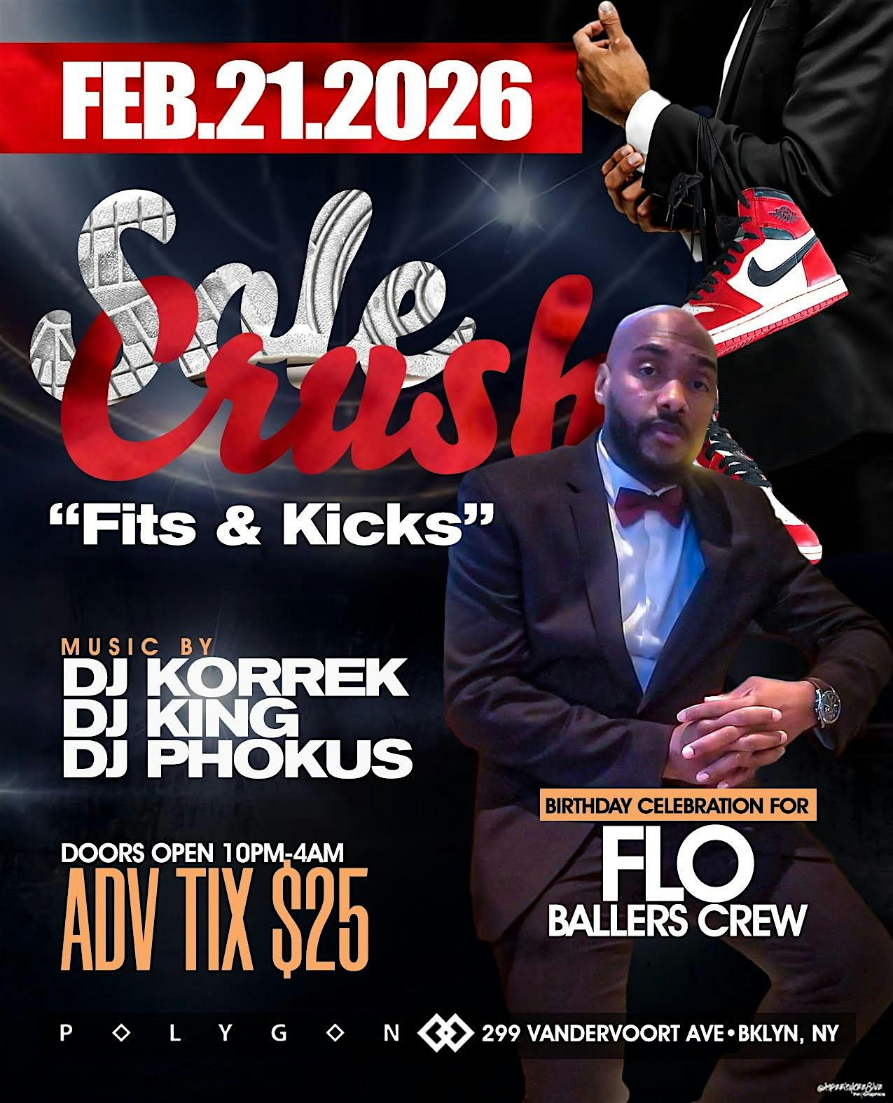 by admin13Feb “ SOLE CRUSH 2026 “ FITS & KICKS AFFAIR at Polygon – Brooklyn, NY “ SOLE CRUSH 2026 “ FITS & KICKS AFFAIR at Polygon – Brooklyn, NY 2 2 people viewed this event. Step into the spotlight and CRUSH the night in undeniable style. SOLE CRUSH isn’t just a sneaker ball—it’s where high fashion meets street! Tickets-RSVP Link Date And Time Sunday, February 22nd, 2026 03:00 AM (PST) Venue Polygon Location 299 Vandervoort Avenue, Brooklyn, NY 11211 Event Types Fashion & BeautyParty or Social Gathering Event Category New York Share With Friends Facebook Twitter Linkedin Xing Pinterest Share This Post: