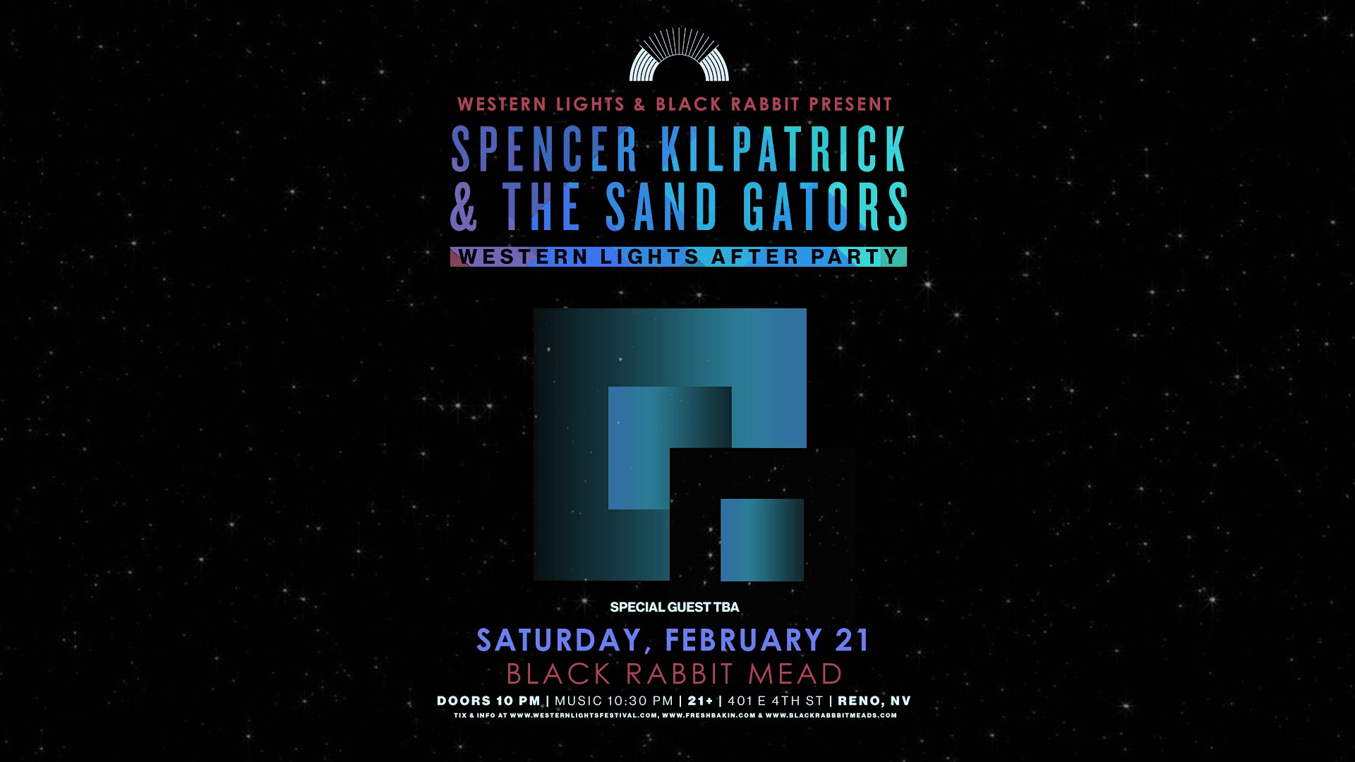 by admin12Feb Spencer Kilpatrick & Sand Gators at Black Rabbit[Western Lights Afterparty] at Black Rabbit Mead Company – Reno, NV Spencer Kilpatrick & Sand Gators at Black Rabbit[Western Lights Afterparty] at Black Rabbit Mead Company – Reno, NV 4 4 people viewed this event. Spencer Kilpatrick & The Sand Gators perform at Black Rabbit Mead for a Western Lights Festival afterparty in Reno, NV. Tickets-RSVP Link Date And Time Sunday, February 22nd, 2026 06:00 AM (PST) Venue Black Rabbit Mead Company Location 401 East 4th Street, Reno, NV 89512 Event Types Concert or PerformanceMusic Event Category NevadaReno Share With Friends Facebook Twitter Linkedin Xing Pinterest Share This Post: