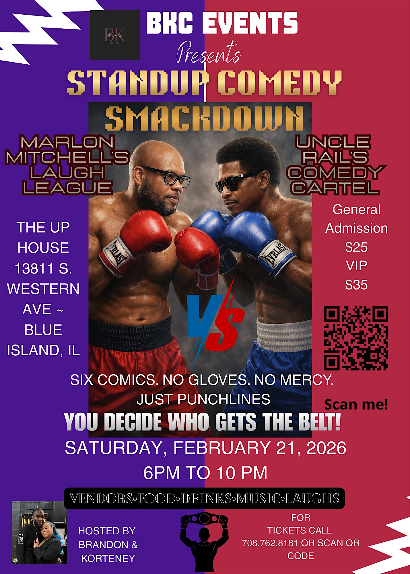 by admin13Feb STANDUP COMEDY SMACKDOWN at UP House – Blue Island, IL STANDUP COMEDY SMACKDOWN at UP House – Blue Island, IL 2 2 people viewed this event. Vendors, food & laughs collide as Marlon Mitchell and Uncle Rail lead teams in a comedy smackdown—audience votes who wins the belt! Tickets-RSVP Link Date And Time Sunday, February 22nd, 2026 12:00 AM (PST) Venue UP House Location 13811 South Western Avenue, Blue Island, IL 60406 Event Types Concert or PerformancePerforming & Visual Arts Event Category Illinois Share With Friends Facebook Twitter Linkedin Xing Pinterest Share This Post: