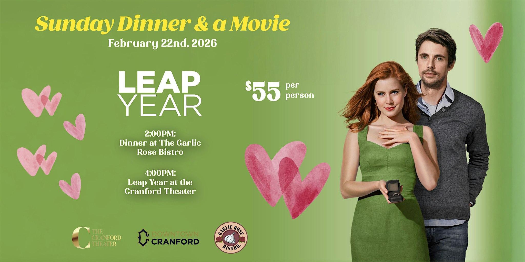 by admin13Feb Sunday Dinner and a Movie – Leap Year at Garlic Rose Bistro – Cranford, NJ Sunday Dinner and a Movie – Leap Year at Garlic Rose Bistro – Cranford, NJ 1 1 people viewed this event. Join us for Sunday dinner at the Garlic Rose Bistro followed by a screening of Leap Year at the Cranford Theater Tickets-RSVP Link Date And Time Sunday, February 22nd, 2026 07:00 PM (PST) Venue Garlic Rose Bistro Location 28 North Avenue West, Cranford, NJ 7016 Event Types Food & Drink Event Category New Jersey Share With Friends Facebook Twitter Linkedin Xing Pinterest Share This Post: