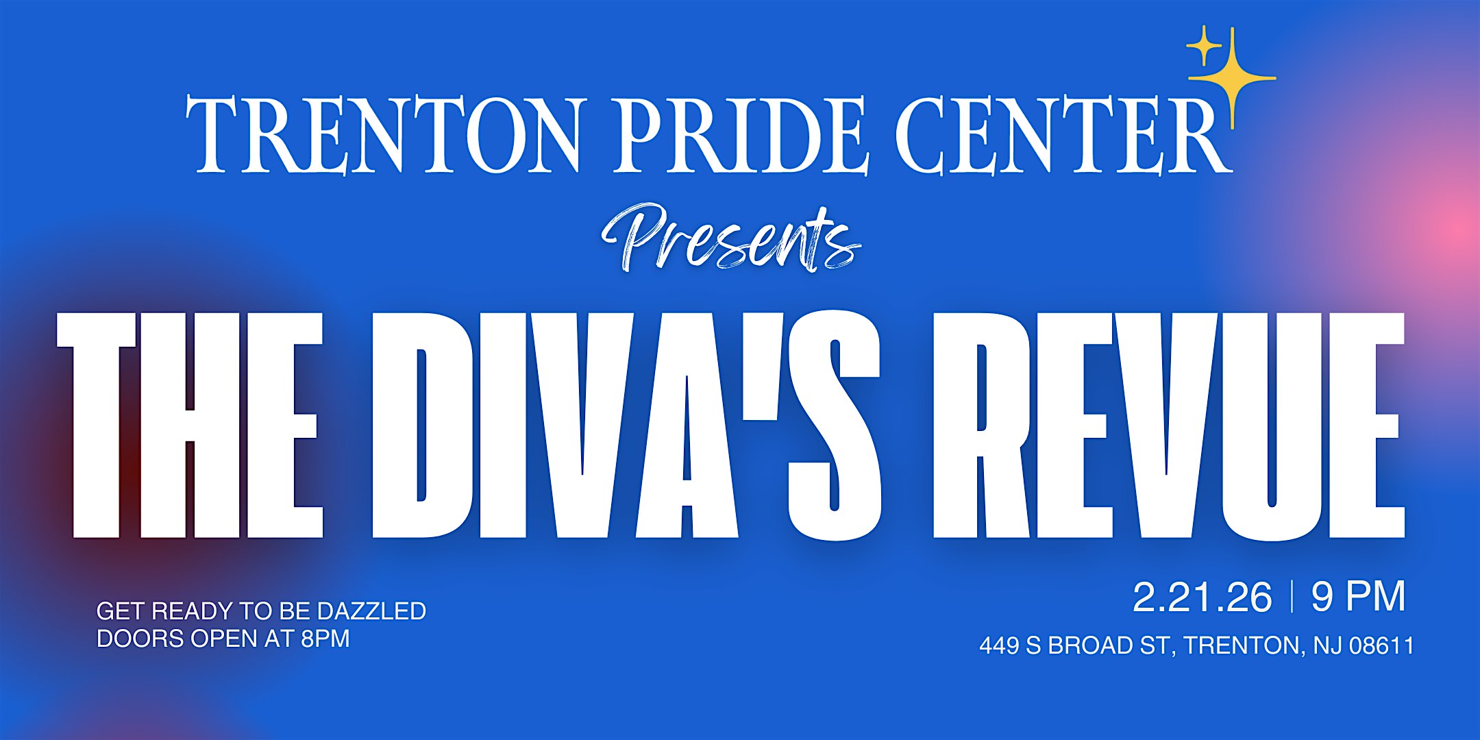 by admin12Feb The Trenton Pride Center Presents: The Diva’s Revue at Trenton Social – Trenton, NJ The Trenton Pride Center Presents: The Diva’s Revue at Trenton Social – Trenton, NJ 3 3 people viewed this event. Get ready to slay at The Diva’s Revue, live and fabulous, hosted by The Trenton Pride Center! Tickets-RSVP Link Date And Time Sunday, February 22nd, 2026 02:00 AM (PST) Venue Trenton Social Location 449 South Broad Street, Trenton, NJ 8611 Event Types Community & CultureConcert or Performance Event Category New Jersey Share With Friends Facebook Twitter Linkedin Xing Pinterest Share This Post: