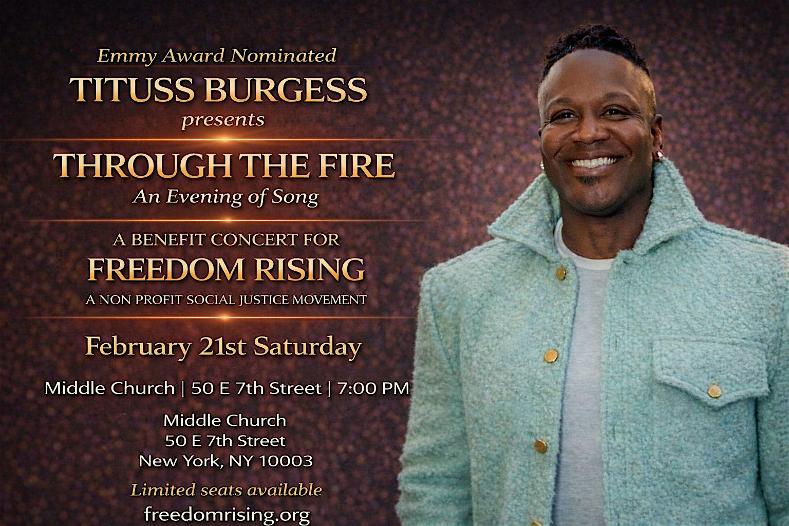 by admin13Feb Tituss Burgess : Through the Fire Concert at Middle Collegiate Church – New York, NY Tituss Burgess : Through the Fire Concert at Middle Collegiate Church – New York, NY 1 1 people viewed this event. Join Emmy Award–nominated artist Tituss Burgess for Through the Fire, an evening of song in support of Freedom Rising. Tickets-RSVP Link Date And Time Sunday, February 22nd, 2026 12:00 AM (PST) Venue Middle Collegiate Church Location 50 East 7th Street, New York, NY 10003 Event Types Concert or PerformancePerforming & Visual Arts Event Category New YorkNew York City Share With Friends Facebook Twitter Linkedin Xing Pinterest Share This Post: