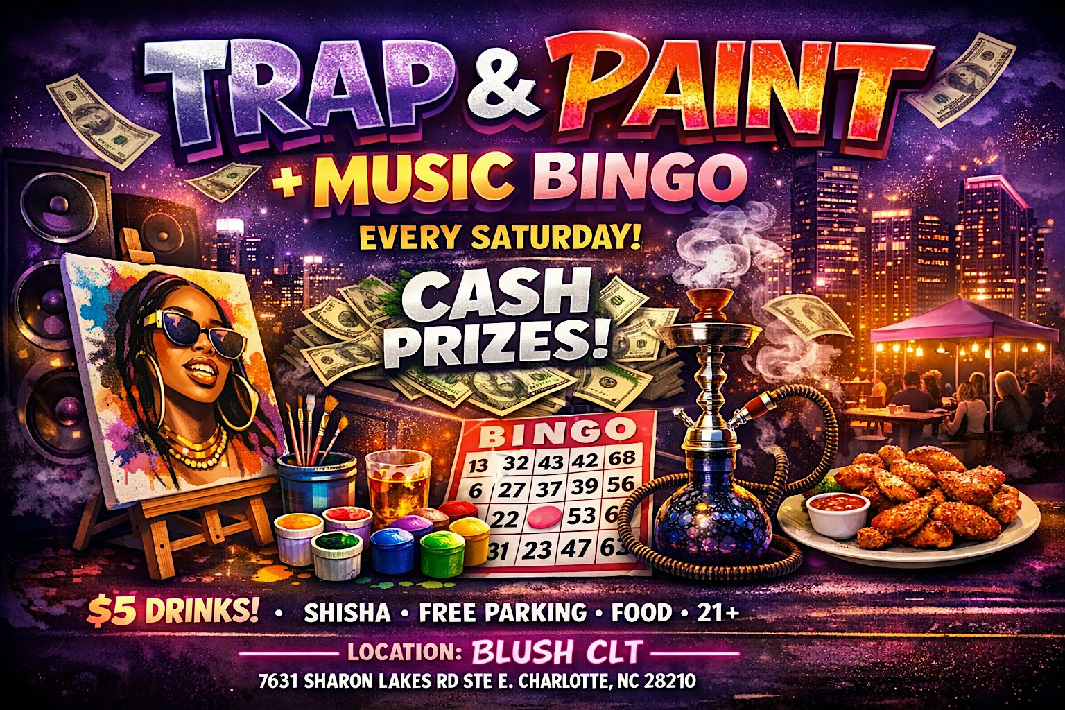 by admin13Feb Trap & Paint + Music Bingo at Blush CLT – Charlotte, NC Trap & Paint + Music Bingo at Blush CLT – Charlotte, NC 1 1 people viewed this event. Come vibe with us at Trap & Paint + Music Bingo every Friday & Saturday for a night of creativity and fun! Tickets-RSVP Link Date And Time Sunday, February 22nd, 2026 12:00 AM (PST) Venue Blush CLT Location 7631 Sharon Lakes Rd, Charlotte, NC 28210 Event Types MusicParty or Social Gathering Event Category CharlotteNorth Carolina Share With Friends Facebook Twitter Linkedin Xing Pinterest Share This Post: