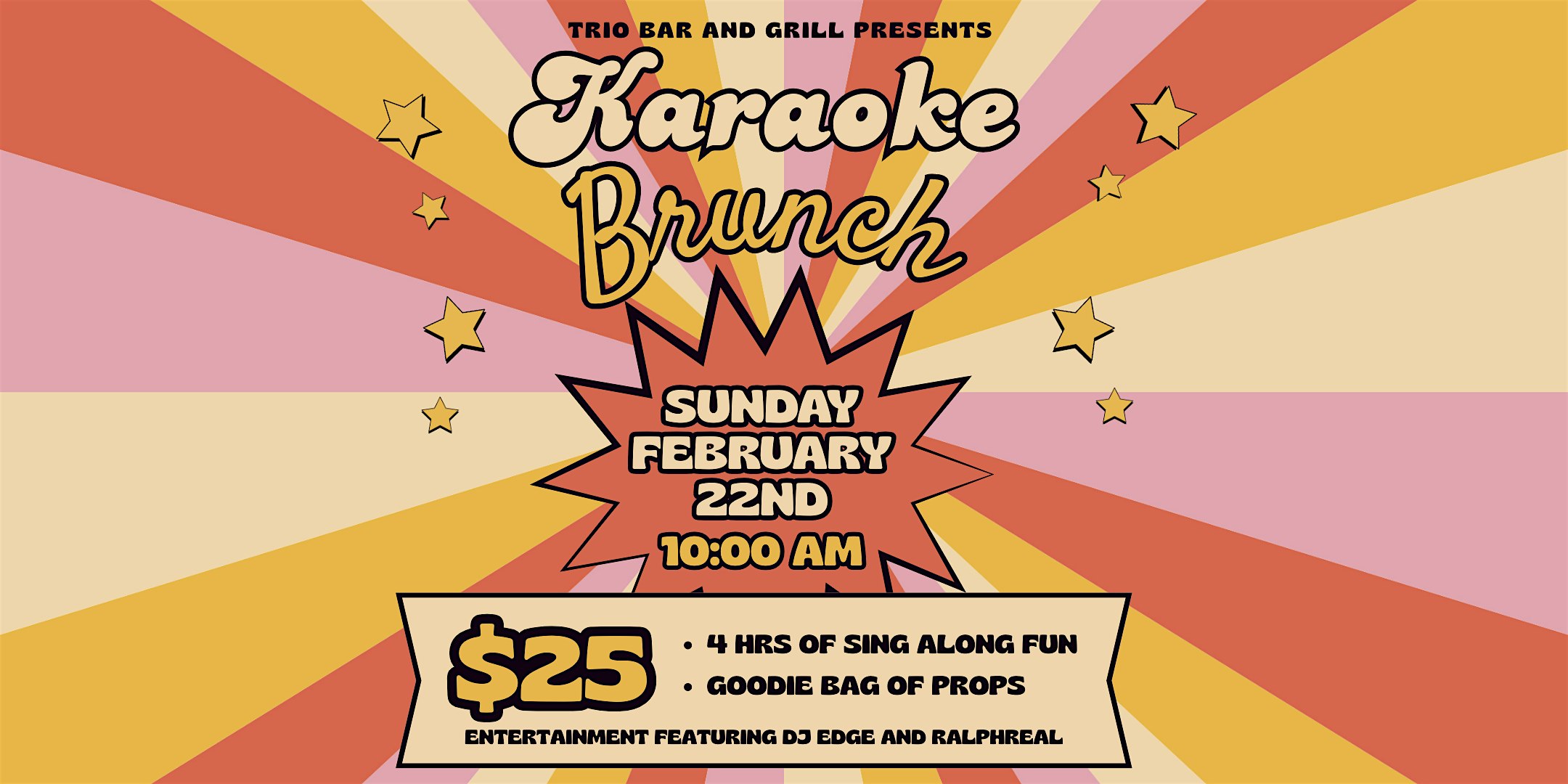 by admin12Feb Trio Sing Along Karaoke Brunch at Trio Bar And Grill – Columbia, PA Trio Sing Along Karaoke Brunch at Trio Bar And Grill – Columbia, PA 3 3 people viewed this event. Grab your friends and hit the mic for a fun-filled Trio Sing Along Karaoke Brunch! Tickets-RSVP Link Date And Time Sunday, February 22nd, 2026 03:00 PM (PST) Venue Trio Bar And Grill Location 3707 Marietta Avenue, Columbia, PA 17512 Event Types MusicParty or Social Gathering Event Category Pennsylvania Share With Friends Facebook Twitter Linkedin Xing Pinterest Share This Post: