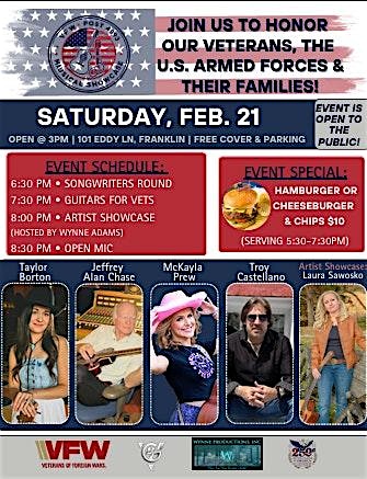by admin13Feb VFW Post 4893 Musical Showcase at VFW Post 4893 – Franklin, TN VFW Post 4893 Musical Showcase at VFW Post 4893 – Franklin, TN 2 2 people viewed this event. Get ready for a great evening at VFW Post 4893’s Musical Showcase & Dinner Special! Tickets-RSVP Link Date And Time Sunday, February 22nd, 2026 12:00 AM (PST) Venue VFW Post 4893 Location 101 Eddy Lane, Franklin, TN 37064 Event Types Concert or PerformanceMusic Event Category Tennessee Share With Friends Facebook Twitter Linkedin Xing Pinterest Share This Post:
