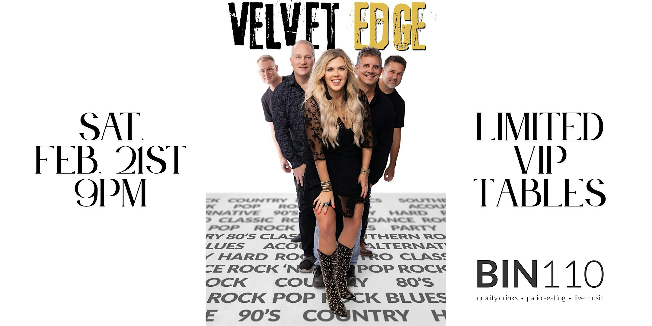by admin12Feb VIP Table Reservations for Velvet Edge @ Bin110 2/21/26 at Bin 110 – Cornelius, NC VIP Table Reservations for Velvet Edge @ Bin110 2/21/26 at Bin 110 – Cornelius, NC 5 5 people viewed this event. Velvet Edge returns to Bin110, after crushing their debut back in January! One of the best bands on the rise in the Charlotte area ! Tickets-RSVP Link Date And Time Sunday, February 22nd, 2026 02:00 AM (PST) Venue Bin 110 Location 19712 One Norman Blvd., Cornelius, NC 28031 Event Types MusicParty or Social Gathering Event Category CharlotteNorth Carolina Share With Friends Facebook Twitter Linkedin Xing Pinterest Share This Post: