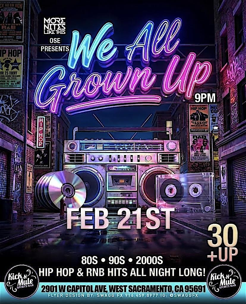 by admin13Feb We All Grown Up. Throwbacks at Kick n Mule at Kick’n Mule Restaurant and Sports Bar – West Sacramento, CA We All Grown Up. Throwbacks at Kick n Mule at Kick’n Mule Restaurant and Sports Bar – West Sacramento, CA 2 2 people viewed this event. Get ready to vibe with old school jams and good times at Kick n Mule—where memories come alive! Tickets-RSVP Link Date And Time Sunday, February 22nd, 2026 05:00 AM (PST) Venue Kick'n Mule Restaurant and Sports Bar Location 2901 West Capitol Avenue, West Sacramento, CA 95691 Event Types MusicParty or Social Gathering Event Category CaliforniaSacramento Share With Friends Facebook Twitter Linkedin Xing Pinterest Share This Post: