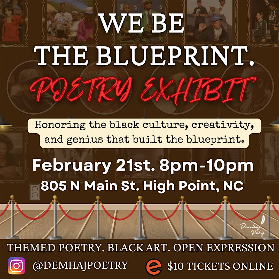 by admin13Feb We Be The Blueprint- A BHM Poetry Exhibit at Demhaj Coffee & Poetry Lounge – High Point, NC We Be The Blueprint- A BHM Poetry Exhibit at Demhaj Coffee & Poetry Lounge – High Point, NC 2 2 people viewed this event. A poetry show honoring the black culture, creativity, and genius that built the blueprint. Tickets-RSVP Link Date And Time Sunday, February 22nd, 2026 01:00 AM (PST) Venue Demhaj Coffee & Poetry Lounge Location 805 North Main Street, High Point, NC 27262 Event Types Community & CultureConcert or Performance Event Category GreensboroNorth Carolina Share With Friends Facebook Twitter Linkedin Xing Pinterest Share This Post: