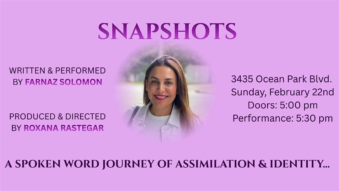 by admin13Feb 4th Performance of Snapshots- Stories of Becoming at 3435 Ocean Park Blvd #107 – Santa Monica, CA 4th Performance of Snapshots- Stories of Becoming at 3435 Ocean Park Blvd #107 – Santa Monica, CA 2 2 people viewed this event. Join Farnaz for a deeply personal spoken word theater journey as she explores assimilation, love, identity and becoming. Tickets-RSVP Link Date And Time Monday, February 23rd, 2026 01:00 AM (PST) Venue 3435 Ocean Park Blvd #107 Location 3435 Ocean Park Boulevard, Santa Monica, CA 90405 Event Types Performing & Visual Arts Event Category CaliforniaLos Angeles Share With Friends Facebook Twitter Linkedin Xing Pinterest Share This Post: