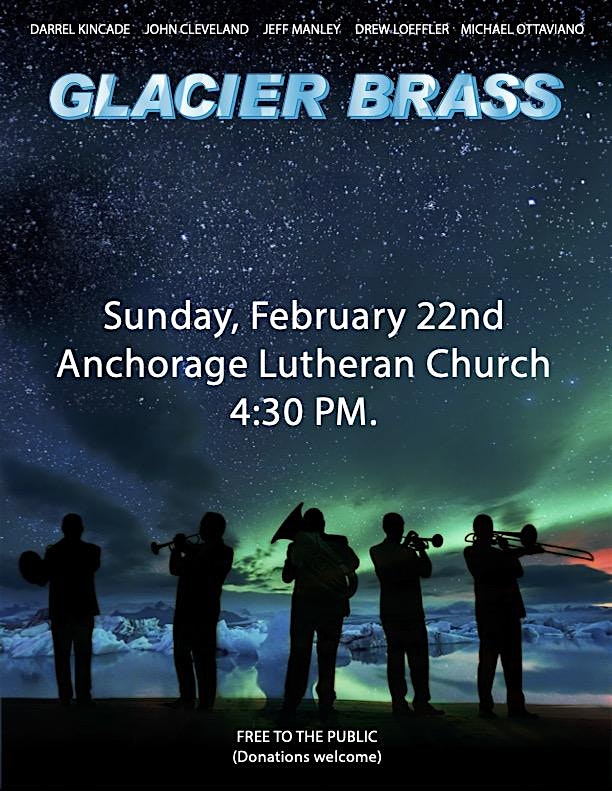 by admin12Feb ALC Concert Series: Glacier Brass at Anchorage Lutheran Church – Anchorage, AK ALC Concert Series: Glacier Brass at Anchorage Lutheran Church – Anchorage, AK 3 3 people viewed this event. Glacier Brass Sunday, February 22nd Anchorage Lutheran Church 1420 N St 4:30 PM Tickets-RSVP Link Date And Time Monday, February 23rd, 2026 01:00 AM (PST) Venue Anchorage Lutheran Church Location 1420 N Street, Anchorage, AK 99501 Event Types Concert or PerformancePerforming & Visual Arts Event Category AlaskaAnchorage Share With Friends Facebook Twitter Linkedin Xing Pinterest Share This Post: