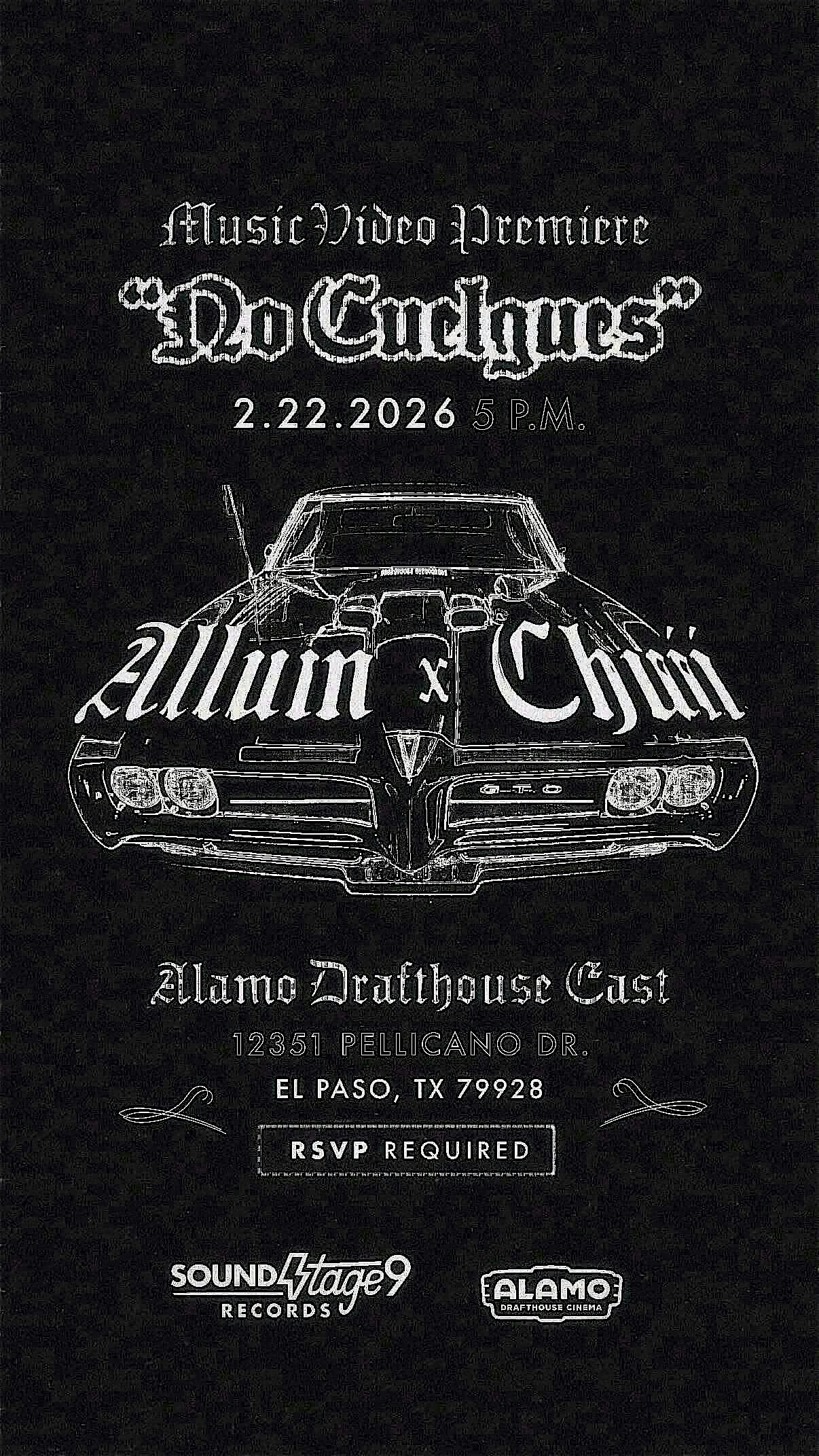 by admin13Feb ALLUIN X CHUII “No Cuelgues” Music Video Premiere at Alamo Drafthouse Cinema East El Paso – El Paso, TX ALLUIN X CHUII “No Cuelgues” Music Video Premiere at Alamo Drafthouse Cinema East El Paso – El Paso, TX 4 4 people viewed this event. The beginning starts here. Exclusive premiere of ALLUIN’s debut single “No Cuelgues” and official music video. Tickets-RSVP Link Date And Time Monday, February 23rd, 2026 12:00 AM (PST) Venue Alamo Drafthouse Cinema East El Paso Location 12351 Pellicano Drive, El Paso, TX 79928 Event Types Concert or PerformanceMusic Event Category El PasoTexas Share With Friends Facebook Twitter Linkedin Xing Pinterest Share This Post: