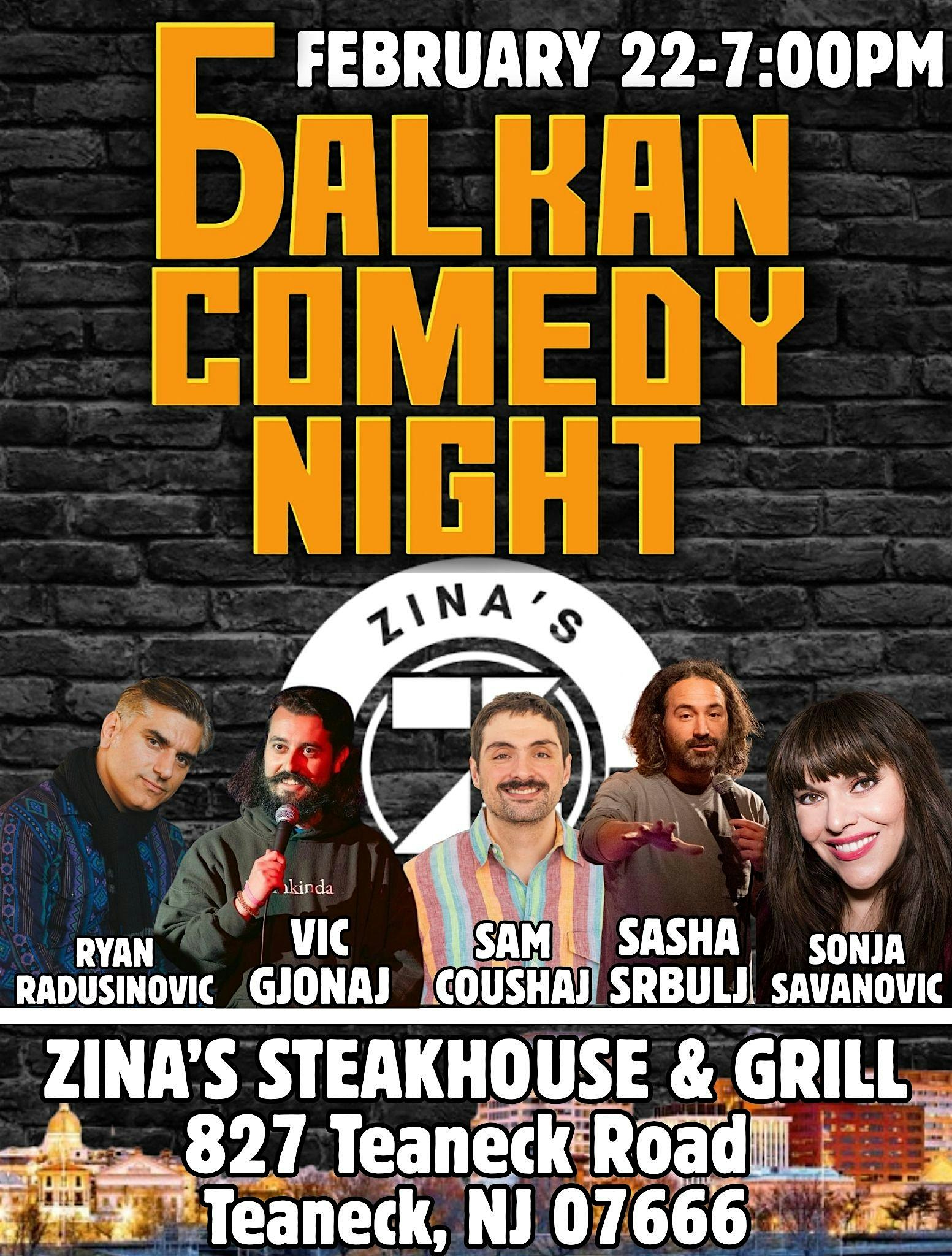 by admin12Feb Balkan Comedy Night Sunday at Zina’s Steakhouse & Grill – Teaneck, NJ Balkan Comedy Night Sunday at Zina’s Steakhouse & Grill – Teaneck, NJ 3 3 people viewed this event. Balkan Comedy Night is back in Teaneck, NJ for a special show on Sunday Feb. 22; Get ready to laugh at jokes from the motherland! Tickets-RSVP Link Date And Time Monday, February 23rd, 2026 12:00 AM (PST) Venue Zina's Steakhouse & Grill Location 827 Teaneck Road, Teaneck, NJ 7666 Event Types Concert or PerformancePerforming & Visual Arts Event Category New Jersey Share With Friends Facebook Twitter Linkedin Xing Pinterest Share This Post: