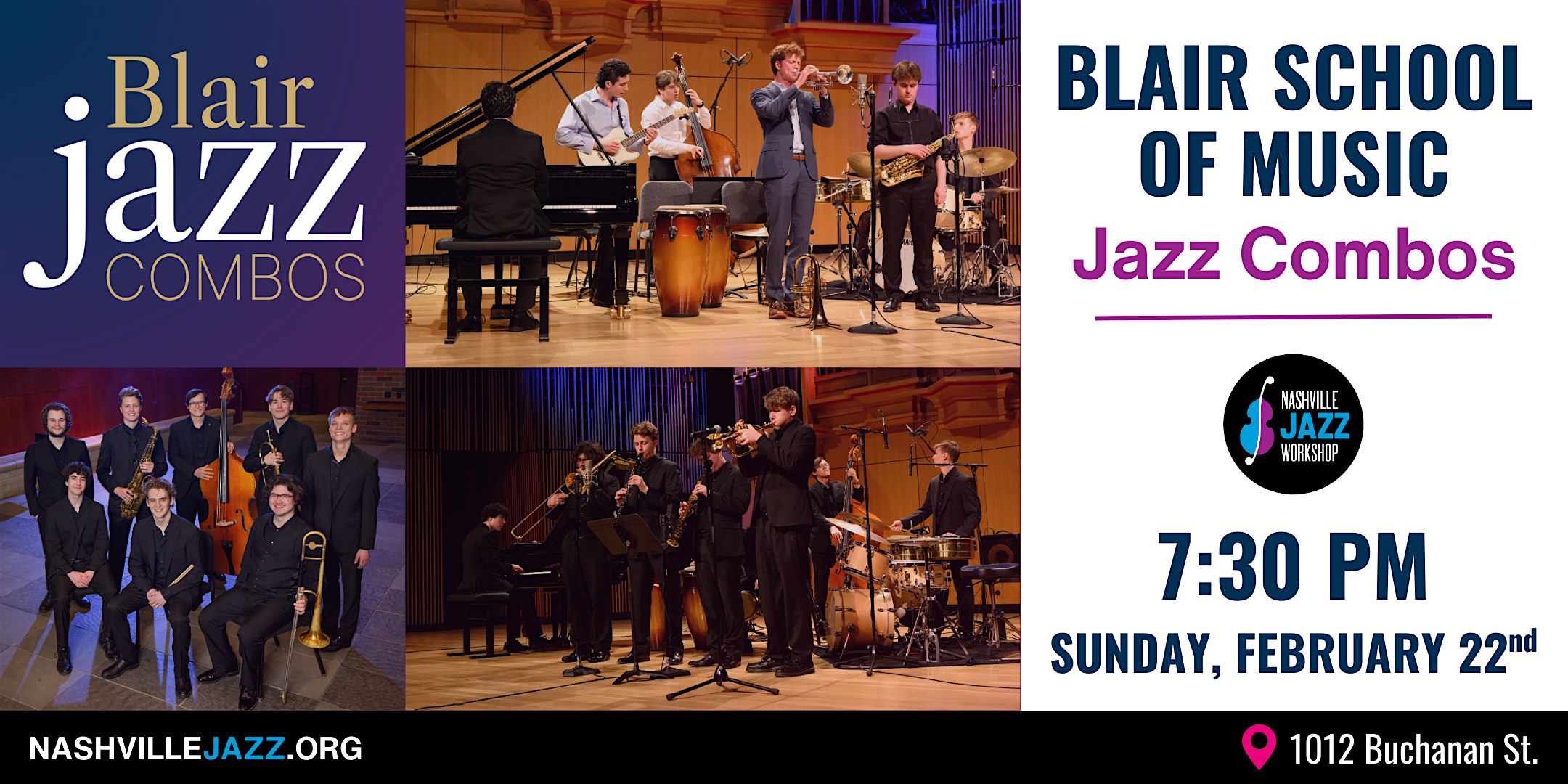 by admin12Feb Blair School of Music Jazz Combos at Nashville Jazz Workshop – Nashville, TN Blair School of Music Jazz Combos at Nashville Jazz Workshop – Nashville, TN 6 6 people viewed this event. The award-winning Jazz Program at Vanderbilt’s Blair School of Music takes the stage at NJW for a special showcase of young talent! Tickets-RSVP Link Date And Time Monday, February 23rd, 2026 01:00 AM (PST) Venue Nashville Jazz Workshop Location 1012 Buchanan Street, Nashville, TN 37208 Event Types Concert or PerformanceMusic Event Category NashvilleTennessee Share With Friends Facebook Twitter Linkedin Xing Pinterest Share This Post: