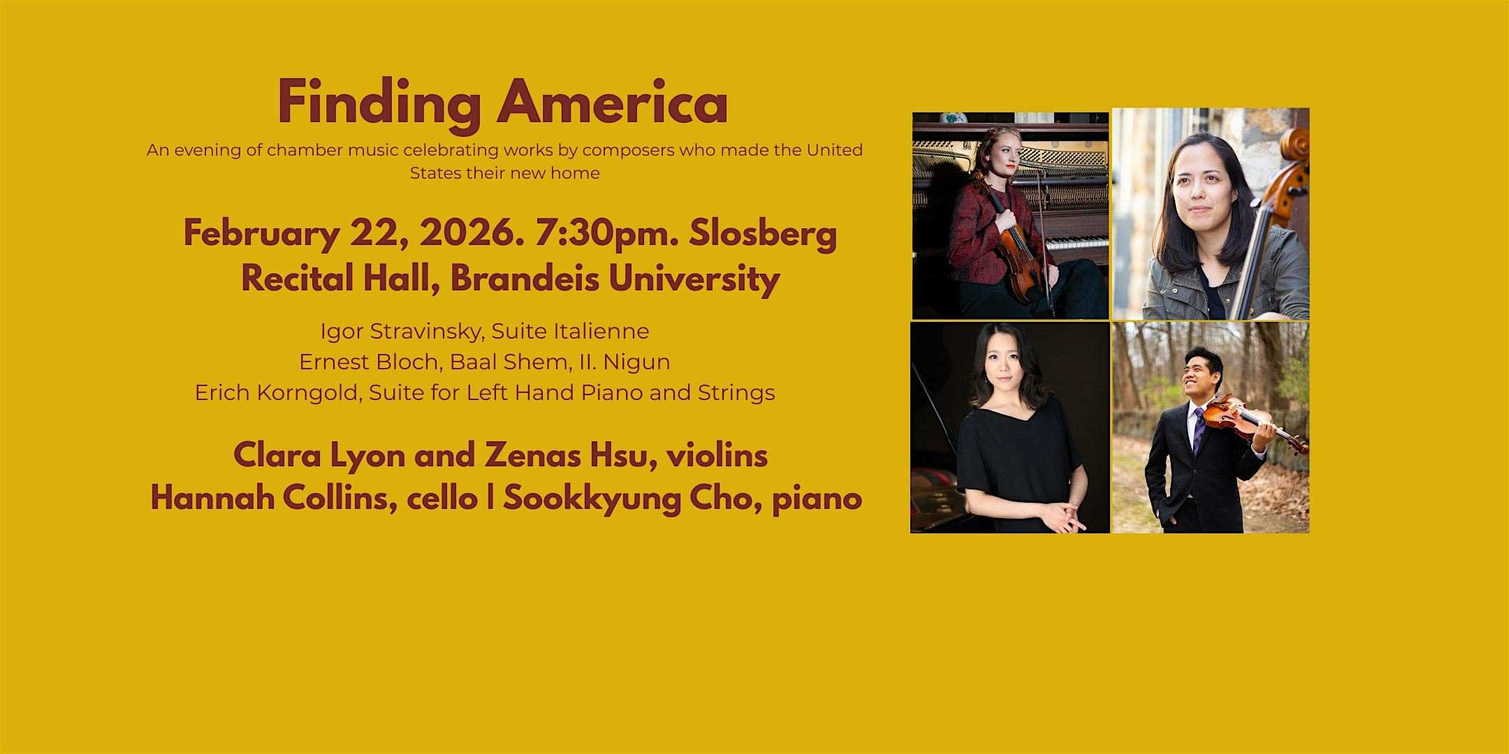 by admin13Feb “Finding America”: Clara Lyon & Friends at Slosberg Music Center – Waltham, MA “Finding America”: Clara Lyon & Friends at Slosberg Music Center – Waltham, MA 2 2 people viewed this event. Join us for “Finding America: An evening of chamber music celebrating works by composers who made the United States their new home.” Tickets-RSVP Link Date And Time Monday, February 23rd, 2026 12:00 AM (PST) Venue Slosberg Music Center Location 415 South Street, Waltham, MA 2453 Event Types Concert or PerformancePerforming & Visual Arts Event Category Massachusetts Share With Friends Facebook Twitter Linkedin Xing Pinterest Share This Post: