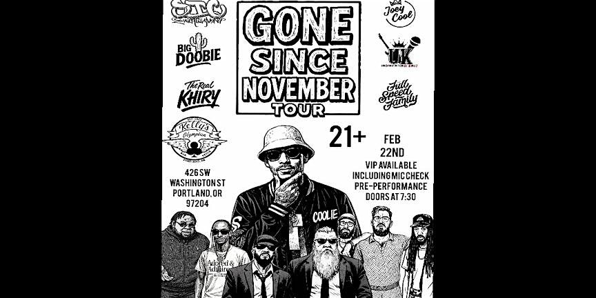 by admin13Feb GONE SINCE NOVEMBER TOUR at Kelly’s Olympian – Portland, OR GONE SINCE NOVEMBER TOUR at Kelly’s Olympian – Portland, OR 1 1 people viewed this event. FEAT JOEY COOL, THE UNCONVENTIONAL KINGZ, w THE REAL KHIRY, BIG DOOBIE, FULL SPEED FAMILY Tickets-RSVP Link Date And Time Monday, February 23rd, 2026 04:00 AM (PST) Venue Kelly's Olympian Location 426 Southwest Washington Street, Portland, OR 97204 Event Category OregonPortland Share With Friends Facebook Twitter Linkedin Xing Pinterest Share This Post: