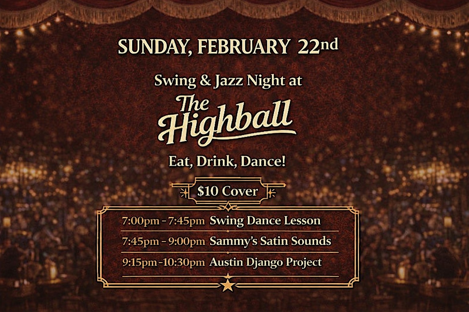 by admin13Feb Jazz Swing Night Ft. Austin Django Project and Sammy’s Satin Sounds at The Highball – Austin, TX Jazz Swing Night Ft. Austin Django Project and Sammy’s Satin Sounds at The Highball – Austin, TX 1 1 people viewed this event. Bring your dancing shoes and join us for a night of throwback swing dancing with two of Austin’s finest jazz groups. Tickets-RSVP Link Date And Time Monday, February 23rd, 2026 01:00 AM (PST) Venue The Highball Location 1120 South Lamar Boulevard, Austin, TX 78704 Event Types Concert or PerformanceMusic Event Category AustinTexas Share With Friends Facebook Twitter Linkedin Xing Pinterest Share This Post: