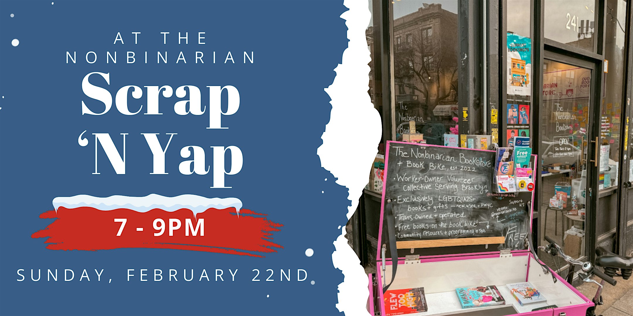 by admin12Feb Scrap ‘N Yap: Winter Edition at The Nonbinarian Bookstore – Brooklyn, NY Scrap ‘N Yap: Winter Edition at The Nonbinarian Bookstore – Brooklyn, NY 7 7 people viewed this event. Stay warm and set your intentions for 2026 with a crafting session at you local Queer bookstore! Supplies will be provided. Tickets-RSVP Link Date And Time Monday, February 23rd, 2026 12:00 AM (PST) Venue The Nonbinarian Bookstore Location 1130 President Street, Brooklyn, NY 11225 Event Types Party or Social Gathering Event Category New York Share With Friends Facebook Twitter Linkedin Xing Pinterest Share This Post: