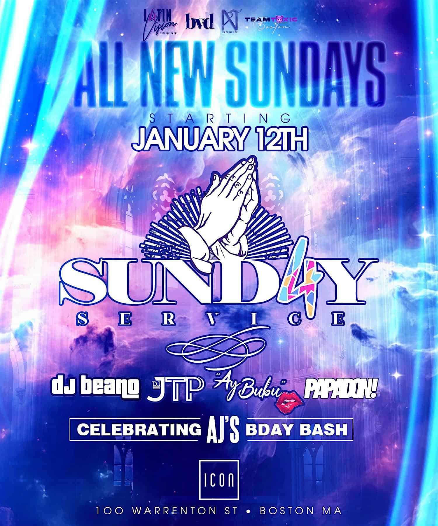 by admin14Feb SUNDAY SERVICE at Icon Nightclub – Boston, MA SUNDAY SERVICE at Icon Nightclub – Boston, MA 1 1 people viewed this event. Join us each and every Sunday at icon for the best night in the city Tickets-RSVP Link Date And Time Monday, February 23rd, 2026 03:00 AM (PST) Venue Icon Nightclub Location 100 Warrenton Street, Boston, MA 2116 Event Types Concert or Performance Event Category BostonMassachusetts Share With Friends Facebook Twitter Linkedin Xing Pinterest Share This Post: