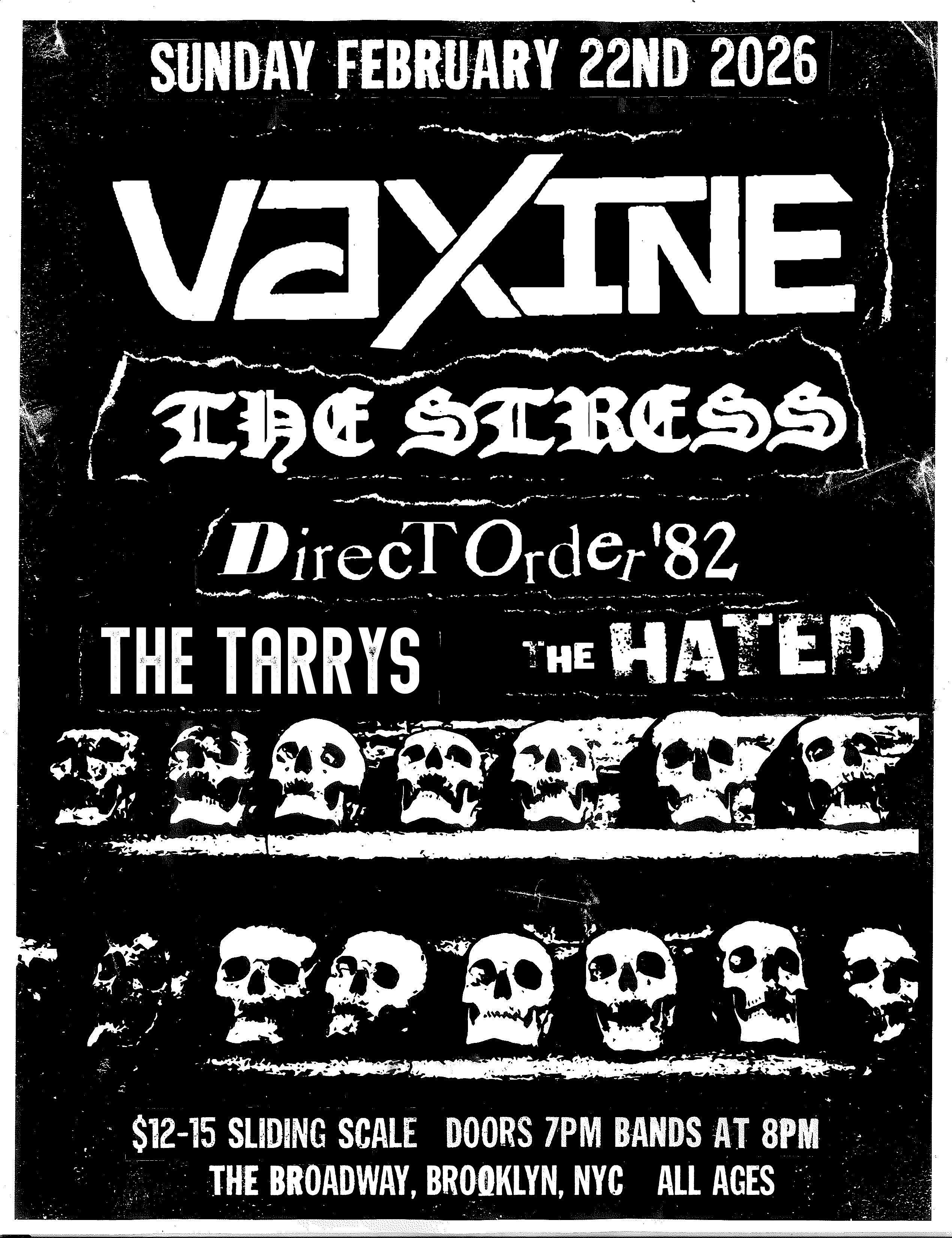 by admin12Feb Vaxine w/ The Stress, Direct Order ’82, The Tarrys + The Hated at The Broadway – Brooklyn, NY Vaxine w/ The Stress, Direct Order ’82, The Tarrys + The Hated at The Broadway – Brooklyn, NY 4 4 people viewed this event. Vaxine headline The Broadway with The Stress, Direct Order ’82, The Tarrys and The Hated Tickets-RSVP Link Date And Time Monday, February 23rd, 2026 12:00 AM (PST) Venue The Broadway Location 1272 Broadway, Brooklyn, NY 11221 Event Types Concert or PerformanceMusic Event Category New York Share With Friends Facebook Twitter Linkedin Xing Pinterest Share This Post: