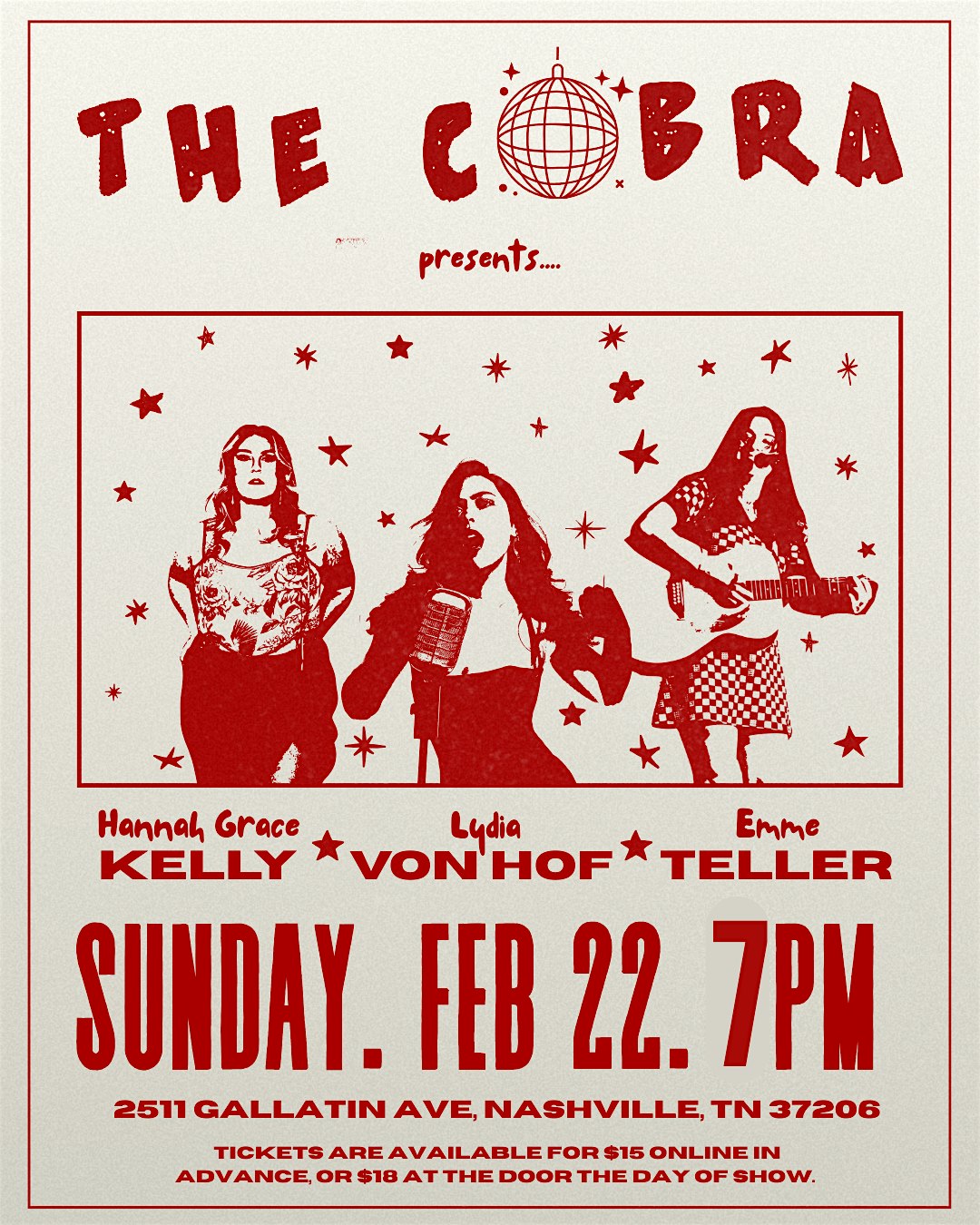 by admin12Feb Venue: Lydia von Hof | Emme Teller | Hanna Grace Kelly at Cobra Nashville – Nashville, TN Venue: Lydia von Hof | Emme Teller | Hanna Grace Kelly at Cobra Nashville – Nashville, TN 6 6 people viewed this event. 18 and UP + Tickets-RSVP Link Date And Time Monday, February 23rd, 2026 01:00 AM (PST) Venue Cobra Nashville Location 2511 Gallatin Avenue, Nashville, TN 37206 Event Types Concert or PerformancePerforming & Visual Arts Event Category NashvilleTennessee Share With Friends Facebook Twitter Linkedin Xing Pinterest Share This Post: