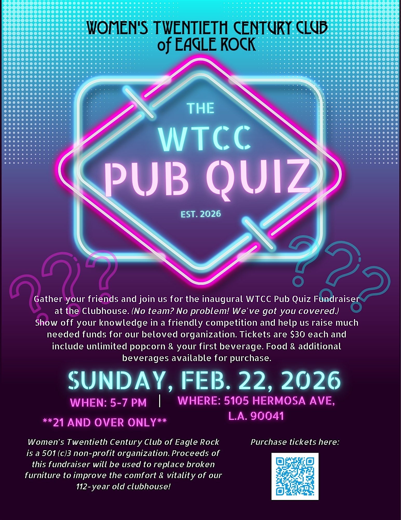 by admin12Feb WTCC Pub Quiz at Women’s Twentieth Century Club of Eagle Rock – Los Angeles, CA WTCC Pub Quiz at Women’s Twentieth Century Club of Eagle Rock – Los Angeles, CA 1 1 people viewed this event. Will you be our very first pub quiz champion? Join us at the Clubhouse for our fundraiser on 2/22/26 and find out! Tickets-RSVP Link Date And Time Monday, February 23rd, 2026 01:00 AM (PST) Venue Women's Twentieth Century Club of Eagle Rock Location 5105 Hermosa Avenue, Los Angeles, CA 90041 Event Types Charity & Causes Event Category CaliforniaLos Angeles Share With Friends Facebook Twitter Linkedin Xing Pinterest Share This Post: