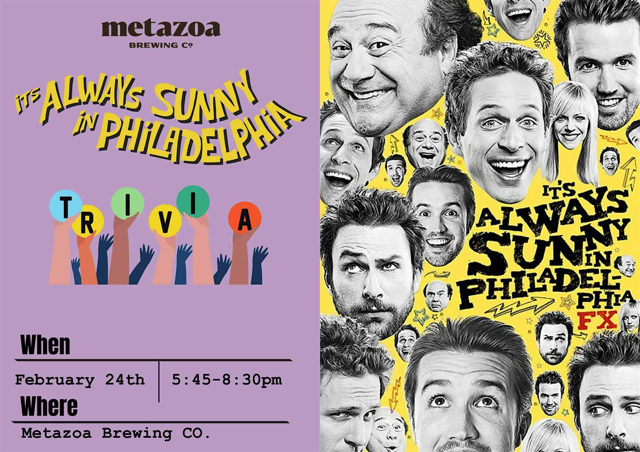 by admin14Feb It’s Always Sunny in Philadelphia Trivia at Metazoa Brewing Company – Indianapolis, IN It’s Always Sunny in Philadelphia Trivia at Metazoa Brewing Company – Indianapolis, IN 3 3 people viewed this event. Join Metazoa for a night of craft beer and themed trivia in our downtown Indianapolis taproom. Reserve 1 table per team, 21+ only. Tickets-RSVP Link Date And Time Tuesday, February 24th, 2026 10:00 PM (PST) Venue Metazoa Brewing Company Location 140 South College Avenue, Indianapolis, IN 46202 Event Types Food & Drink Event Category IndianaIndianapolis Share With Friends Facebook Twitter Linkedin Xing Pinterest Share This Post:
