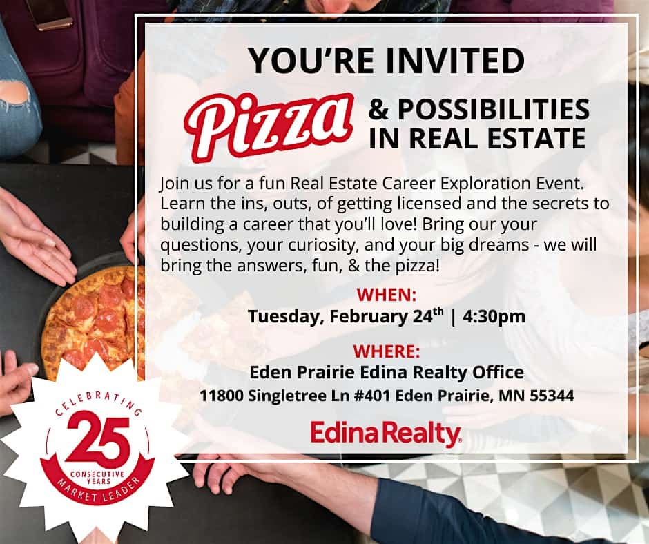 by admin14Feb Pizza & Possibilities In Real Estate at 11800 Singletree Ln suite 401 – Eden Prairie, MN Pizza & Possibilities In Real Estate at 11800 Singletree Ln suite 401 – Eden Prairie, MN 3 3 people viewed this event. Join us for a fun Real Estate Career Exploration Event. Learn the in’s, outs, of getting licensed. Tickets-RSVP Link Date And Time Tuesday, February 24th, 2026 10:00 PM (PST) Venue 11800 Singletree Ln suite 401 Location 11800 Singletree Lane, Eden Prairie, MN 55344 Event Types Food & Drink Event Category MinneapolisMinnesota Share With Friends Facebook Twitter Linkedin Xing Pinterest Share This Post: