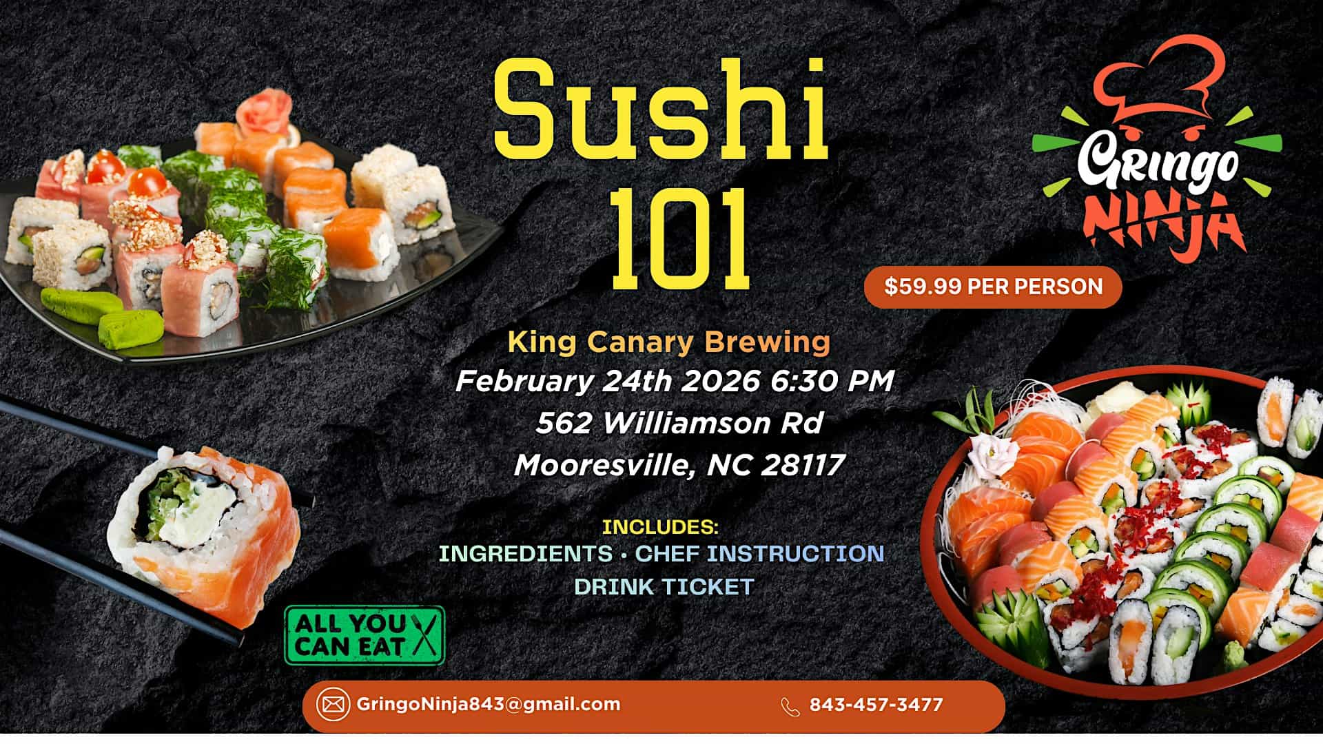 by admin14Feb Sushi Rolling Class at King Canary Brewing – Mooresville, NC Sushi Rolling Class at King Canary Brewing – Mooresville, NC 1 1 people viewed this event. Roll on over and create your own sushi! Led by GringoNinja. This class explores the traditions and techniques of sushi rolling! Tickets-RSVP Link Date And Time Tuesday, February 24th, 2026 11:00 PM (PST) Venue King Canary Brewing Location 562 Williamson Road, Mooresville, NC 28117 Event Types Food & Drink Event Category North Carolina Share With Friends Facebook Twitter Linkedin Xing Pinterest Share This Post: