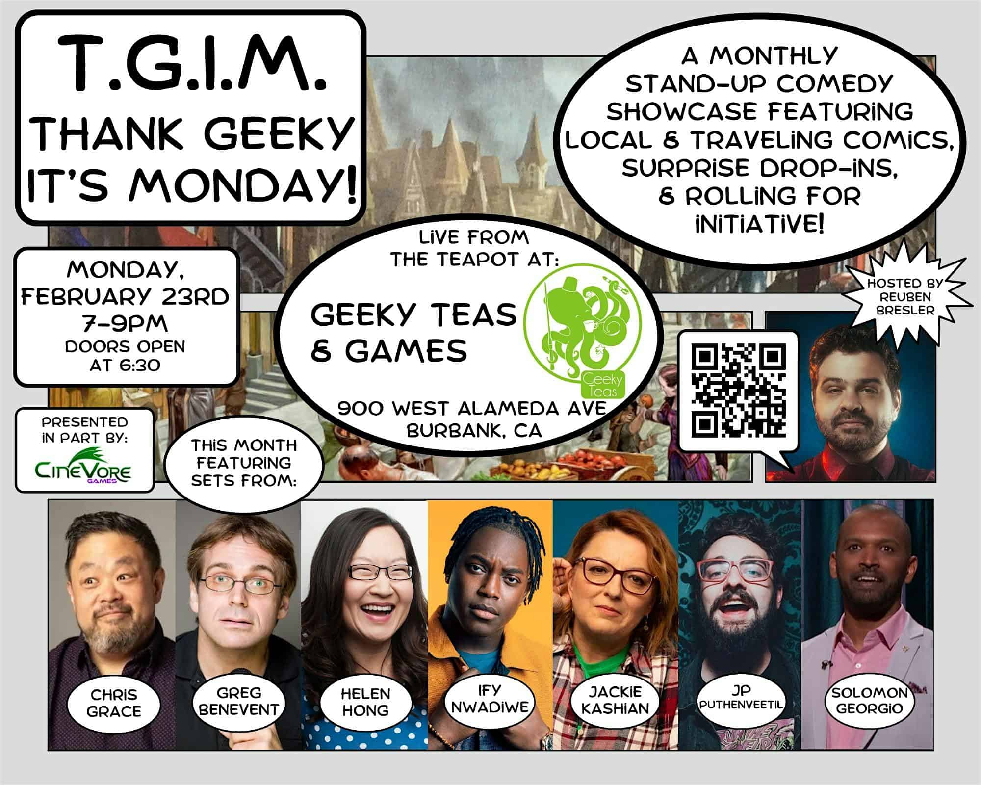 by admin14Feb TGIM – Thank Geeky It’s Monday at Geeky Teas & Games – Burbank, CA TGIM – Thank Geeky It’s Monday at Geeky Teas & Games – Burbank, CA 1 1 people viewed this event. Start your week off right with fellow geeks and stand-up lovers at TGIM! Tickets-RSVP Link Date And Time Tuesday, February 24th, 2026 03:00 AM (PST) Venue Geeky Teas & Games Location 900 West Alameda Avenue, Burbank, CA 91506 Event Types Community & CultureConcert or Performance Event Category CaliforniaLos Angeles Share With Friends Facebook Twitter Linkedin Xing Pinterest Share This Post: