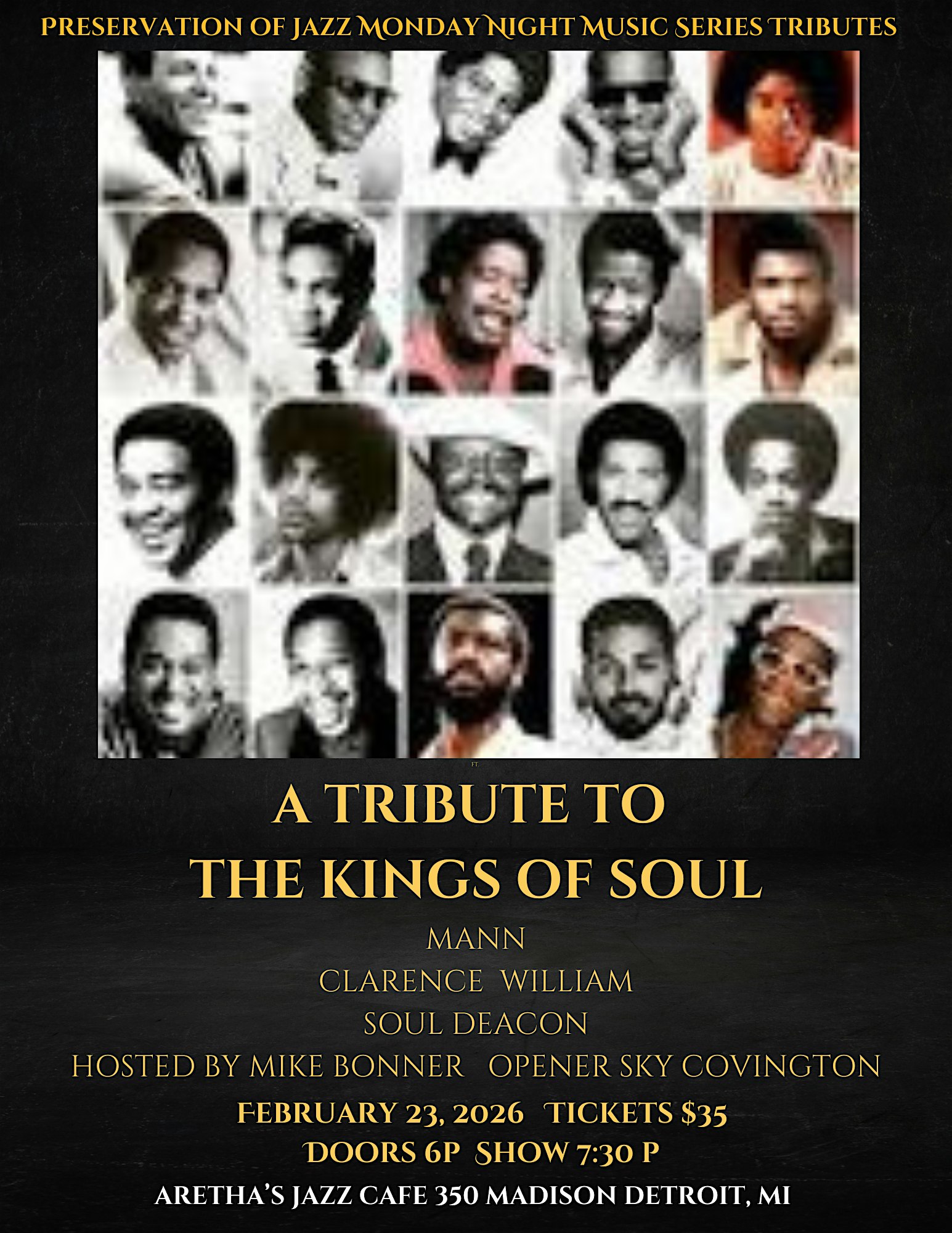 by admin13Feb The Tribute to the Kings of Soul ft. Clarence Williams Mann & Soul Deacon at Aretha’s Jazz Cafe – Detroit, MI The Tribute to the Kings of Soul ft. Clarence Williams Mann & Soul Deacon at Aretha’s Jazz Cafe – Detroit, MI 2 2 people viewed this event. Kings of Soul! Tickets-RSVP Link Date And Time Tuesday, February 24th, 2026 12:00 AM (PST) Venue Aretha's Jazz Cafe Location 350 Madison Street, Detroit, MI 48226 Event Types Concert or PerformanceMusic Event Category DetroitMichigan Share With Friends Facebook Twitter Linkedin Xing Pinterest Share This Post: