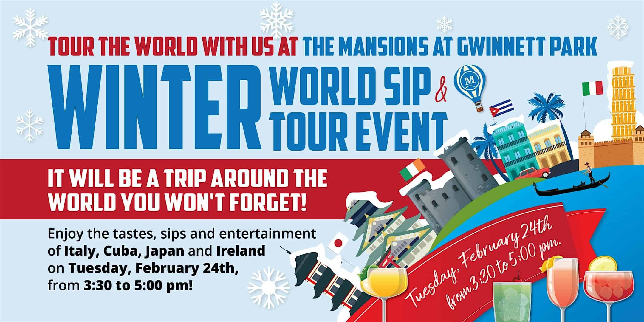 by admin14Feb You’re Invited To Our Winter World Sip & Tour! at The Mansions at Gwinnett Park Senior Independent Living – Lawrenceville, GA You’re Invited To Our Winter World Sip & Tour! at The Mansions at Gwinnett Park Senior Independent Living – Lawrenceville, GA 2 2 people viewed this event. Get ready to sip, stroll, and explore our Winter World – it’s going to be a blast! Tickets-RSVP Link Date And Time Tuesday, February 24th, 2026 08:00 PM (PST) Venue The Mansions at Gwinnett Park Senior Independent Living Location 2400 Buford Drive, Lawrenceville, GA 30043 Event Types Food & Drink Event Category Georgia Share With Friends Facebook Twitter Linkedin Xing Pinterest Share This Post: