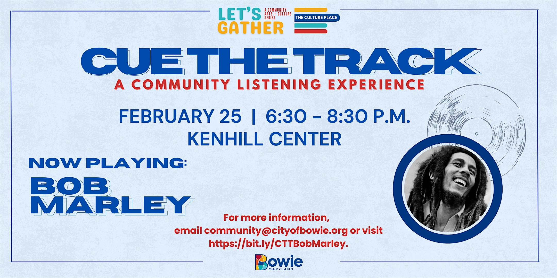 by admin13Feb Black History Month – A Community Listening Experience, Bob Marley at Kenhill Center – Bowie, MD Black History Month – A Community Listening Experience, Bob Marley at Kenhill Center – Bowie, MD 1 1 people viewed this event. Kick back and vibe with the community as we dive into Bob Marley’s greatest tunes together! Tickets-RSVP Link Date And Time Wednesday, February 25th, 2026 11:00 PM (PST) Venue Kenhill Center Location 2614 Kenhill Drive, Bowie, MD 20715 Event Types MusicParty or Social Gathering Event Category BaltimoreMaryland Share With Friends Facebook Twitter Linkedin Xing Pinterest Share This Post: