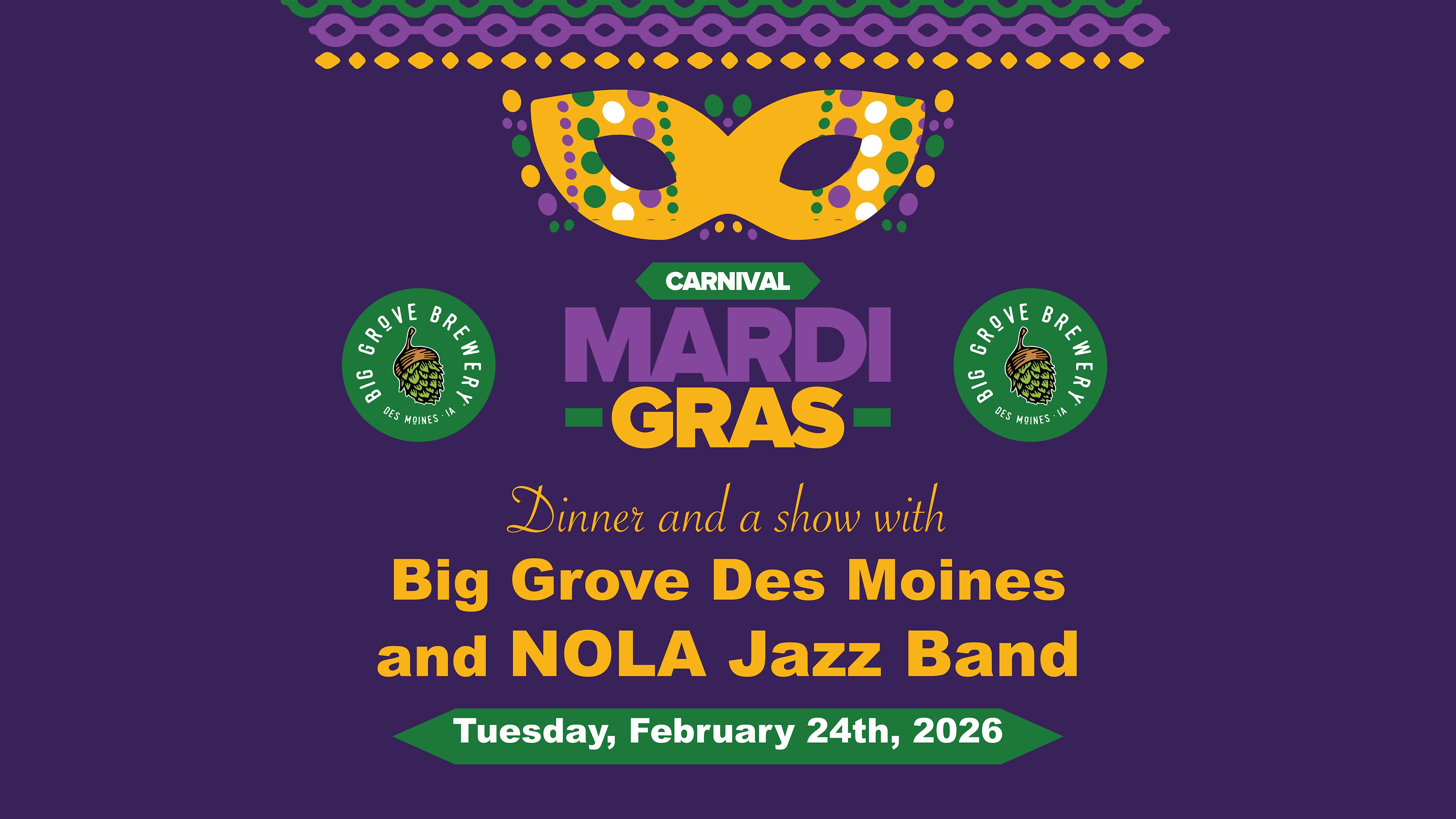 by admin14Feb Mardi Gras Prix Fixe Dinner with NOLA Jazz Band | Big Grove DSM at Big Grove Brewery & Taproom – Des Moines, IA Mardi Gras Prix Fixe Dinner with NOLA Jazz Band | Big Grove DSM at Big Grove Brewery & Taproom – Des Moines, IA 2 2 people viewed this event. Come celebrate the Big Easy at Big Grove! Join us for a Mardi Gras evening featuring seven courses and live music from NOLA Jazz Band. Tickets-RSVP Link Date And Time Wednesday, February 25th, 2026 12:00 AM (PST) Venue Big Grove Brewery & Taproom Location 555 17th Street, Des Moines, IA 50309 Event Types Food & Drink Event Category Des MoinesIowa Share With Friends Facebook Twitter Linkedin Xing Pinterest Share This Post: