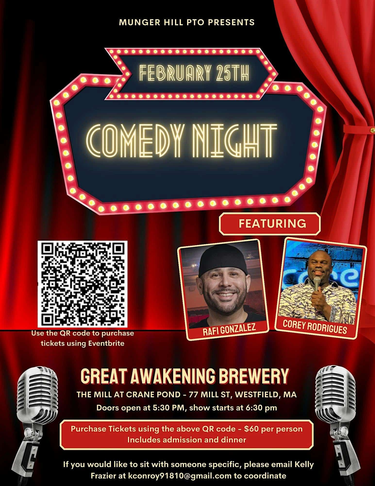 by admin14Feb Munger Hill PTO Fundraiser: Comedy Night Featuring Comedian Rafi Gonzalez at Great Awakening Brewing Co – Westfield, MA Munger Hill PTO Fundraiser: Comedy Night Featuring Comedian Rafi Gonzalez at Great Awakening Brewing Co – Westfield, MA 2 2 people viewed this event. Please join us for a night of laughs while supporting the Munger Hill PTO. Tickets-RSVP Link Date And Time Wednesday, February 25th, 2026 11:00 PM (PST) Venue Great Awakening Brewing Co Location 77 Mill Street, Westfield, MA 1085 Event Types Charity & CausesConcert or Performance Event Category Massachusetts Share With Friends Facebook Twitter Linkedin Xing Pinterest Share This Post: