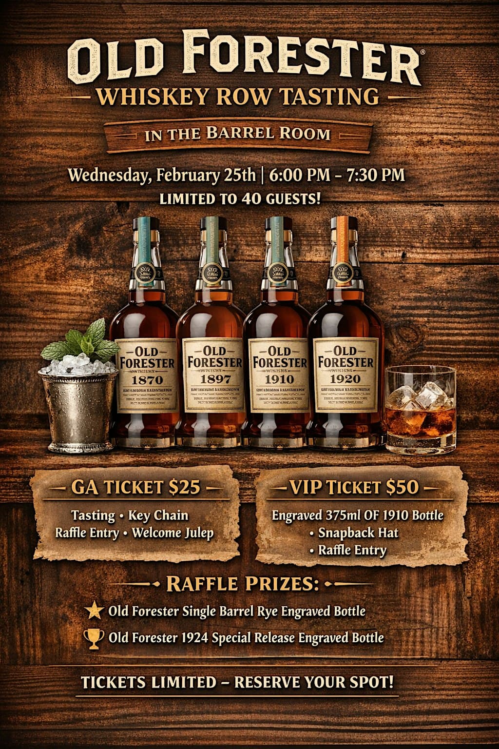 by admin14Feb Old Forester Whiskey Row Tasting | Barrel Room at 1510 Fairfield Ave – Fort Wayne, IN Old Forester Whiskey Row Tasting | Barrel Room at 1510 Fairfield Ave – Fort Wayne, IN 3 3 people viewed this event. Old Forester Whiskey Row Tasting Feb 25 | Barrel Room. GA $25, VIP $50. Mint julep, tastings, raffles & limited spots! Tickets-RSVP Link Date And Time Wednesday, February 25th, 2026 11:00 PM (PST) Venue 1510 Fairfield Ave Location 1510 Fairfield Avenue, Fort Wayne, IN 46802 Event Types Food & Drink Event Category Fort WayneIndiana Share With Friends Facebook Twitter Linkedin Xing Pinterest Share This Post: