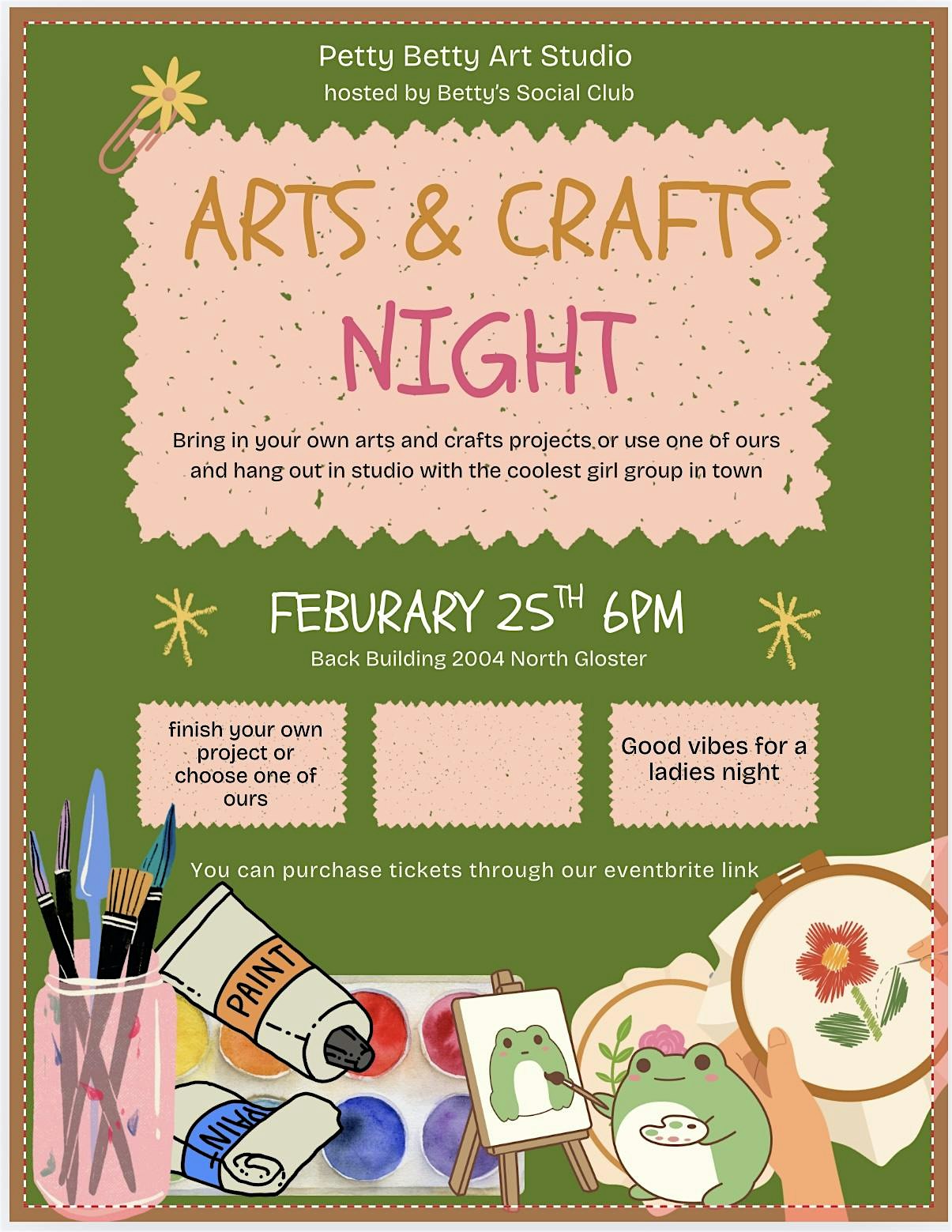 by admin22Feb Petty Betty’s Arts & Crafts Night at Petty Betty Art Studio – Tupelo, MS Petty Betty’s Arts & Crafts Night at Petty Betty Art Studio – Tupelo, MS 1 1 people viewed this event. Come get cozy & creative at Petty Betty’s Arts & Crafts Night – bring your own crafts or choose one of ours. Let’s hang! Tickets-RSVP Link Date And Time Wednesday, February 25th, 2026 06:00 PM (PST) Venue Petty Betty Art Studio Location 2004 North Gloster Street, Tupelo, MS 38804 Event Types Party or Social Gathering Event Category Mississippi Share With Friends Facebook Twitter Linkedin Xing Pinterest Share This Post: