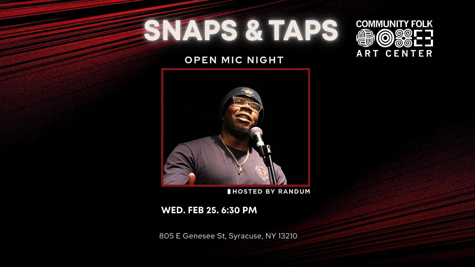 by admin14Feb Snaps & Taps Open Mic Night – Hosted by Randum at Community Folk Art Center – Syracuse, NY Snaps & Taps Open Mic Night – Hosted by Randum at Community Folk Art Center – Syracuse, NY 2 2 people viewed this event. Join us for a night of poetry, music, and good vibes at Snaps & Taps Open Mic Night – Hosted by Randum. Doors open at 6:15 PM Tickets-RSVP Link Date And Time Wednesday, February 25th, 2026 11:00 PM (PST) Venue Community Folk Art Center Location 805 East Genesee Street, Syracuse, NY 13210 Event Types Concert or PerformancePerforming & Visual Arts Event Category New York Share With Friends Facebook Twitter Linkedin Xing Pinterest Share This Post: