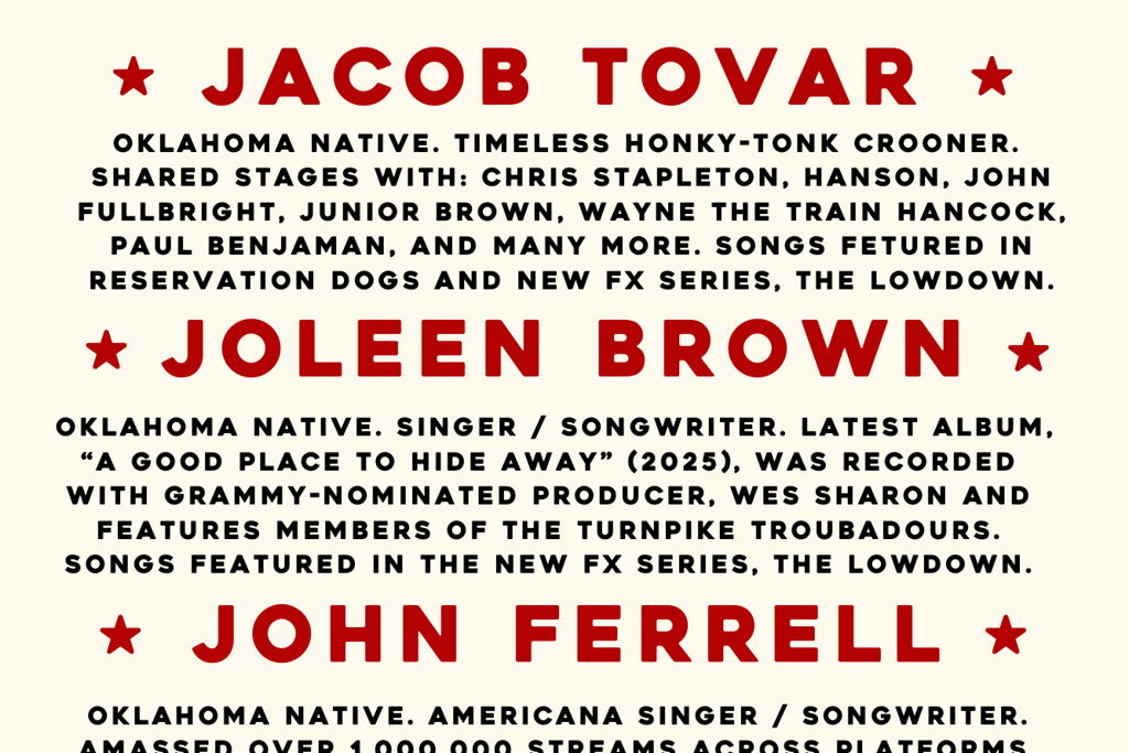 See Songwriter’s Round with Jacob Tovar, Joleen Brown, and John Ferrell Live in Tulsa on Wednesday, February 25, 2026, Doors Open at 5:30 PM