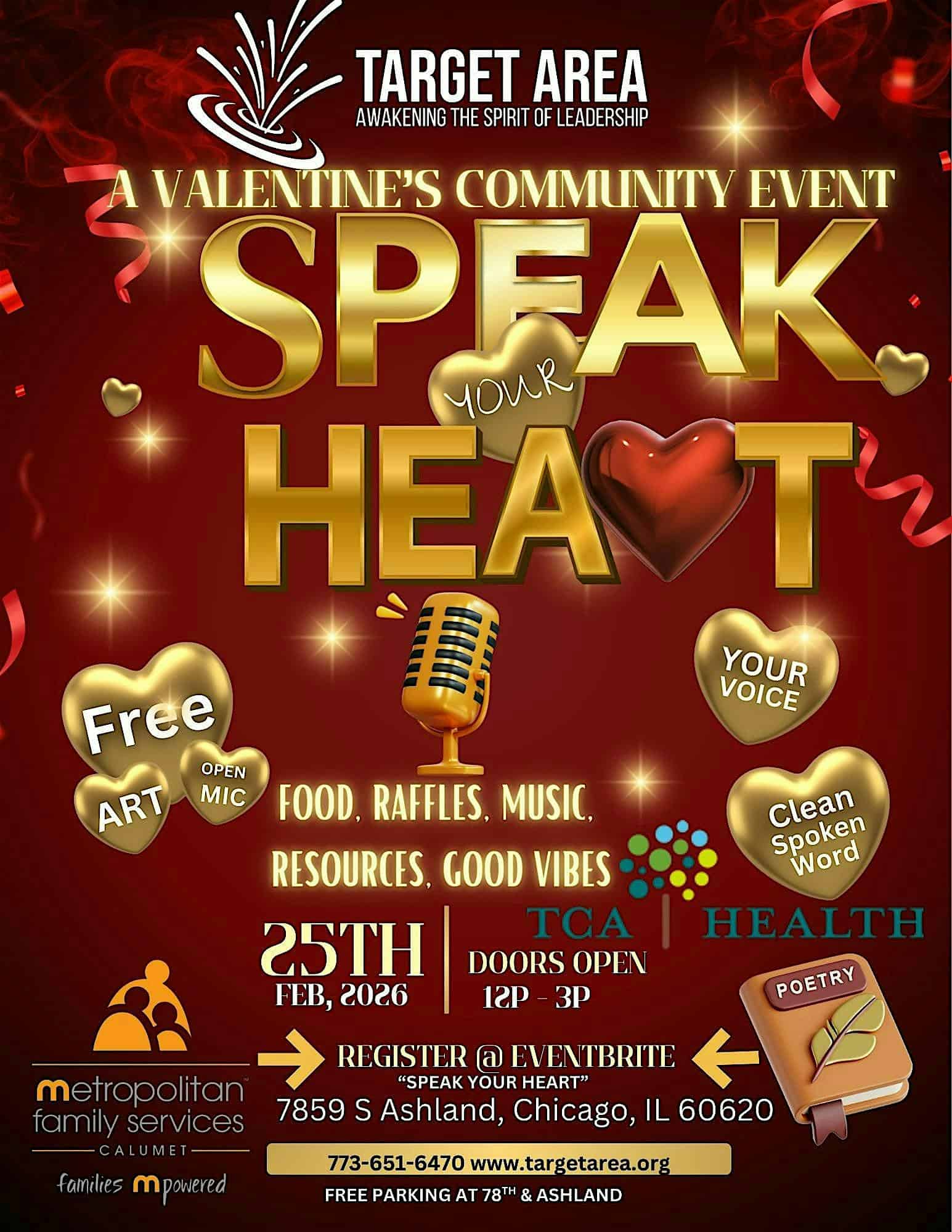 by admin14Feb SPEAK YOUR HEART – Valentines Day Event at 7859 S Ashland Ave – Chicago, IL SPEAK YOUR HEART – Valentines Day Event at 7859 S Ashland Ave – Chicago, IL 2 2 people viewed this event. Love is more than a feeling, it’s a VOICE! JOIN our All-ages community open mic with spoken word, free food, resources, and good vibes!! Tickets-RSVP Link Date And Time Wednesday, February 25th, 2026 06:00 PM (PST) Venue 7859 S Ashland Ave Location 7859 South Ashland Avenue, Chicago, IL 60620 Event Types Community & CultureParty or Social Gathering Event Category ChicagoIllinois Share With Friends Facebook Twitter Linkedin Xing Pinterest Share This Post: