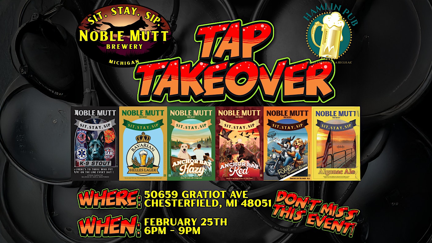 by admin22Feb Tap Takeover at Hamlin Pub | Noble Mutt Brewery at Hamlin Pub – Chesterfield, MI Tap Takeover at Hamlin Pub | Noble Mutt Brewery at Hamlin Pub – Chesterfield, MI 1 1 people viewed this event. Tap Takeover from local Brewery, Noble Mutt, at the Hamlin Pub in Chesterfield Tickets-RSVP Link Date And Time Wednesday, February 25th, 2026 06:00 PM (PST) Venue Hamlin Pub Location 50659 Gratiot Avenue, Chesterfield, MI 48051 Event Types Food & DrinkParty or Social Gathering Event Category Michigan Share With Friends Facebook Twitter Linkedin Xing Pinterest Share This Post: