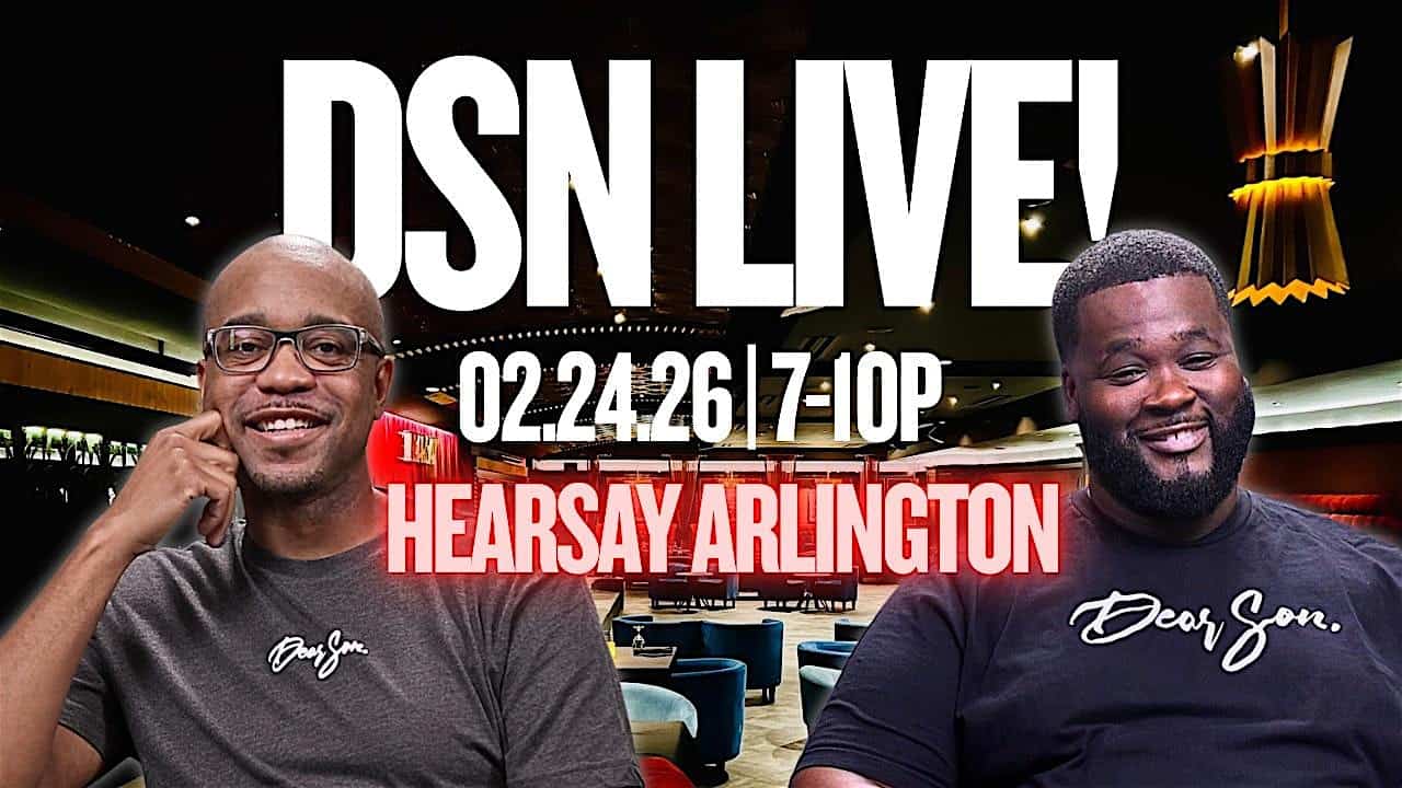 by admin14Feb The DSN Live! Experience at Hearsay Arlington – Arlington, TX The DSN Live! Experience at Hearsay Arlington – Arlington, TX 2 2 people viewed this event. Welcome to The Dear Son, Show! Come enjoy live entertainment, food, drinks, and a live episode recording. The vibe, mature. Limited tickets. Tickets-RSVP Link Date And Time Wednesday, February 25th, 2026 01:00 AM (PST) Venue Hearsay Arlington Location 1711 East Randol Mill Road, Arlington, TX 76011 Event Types Community & CultureConcert or Performance Event Category Texas Share With Friends Facebook Twitter Linkedin Xing Pinterest Share This Post: