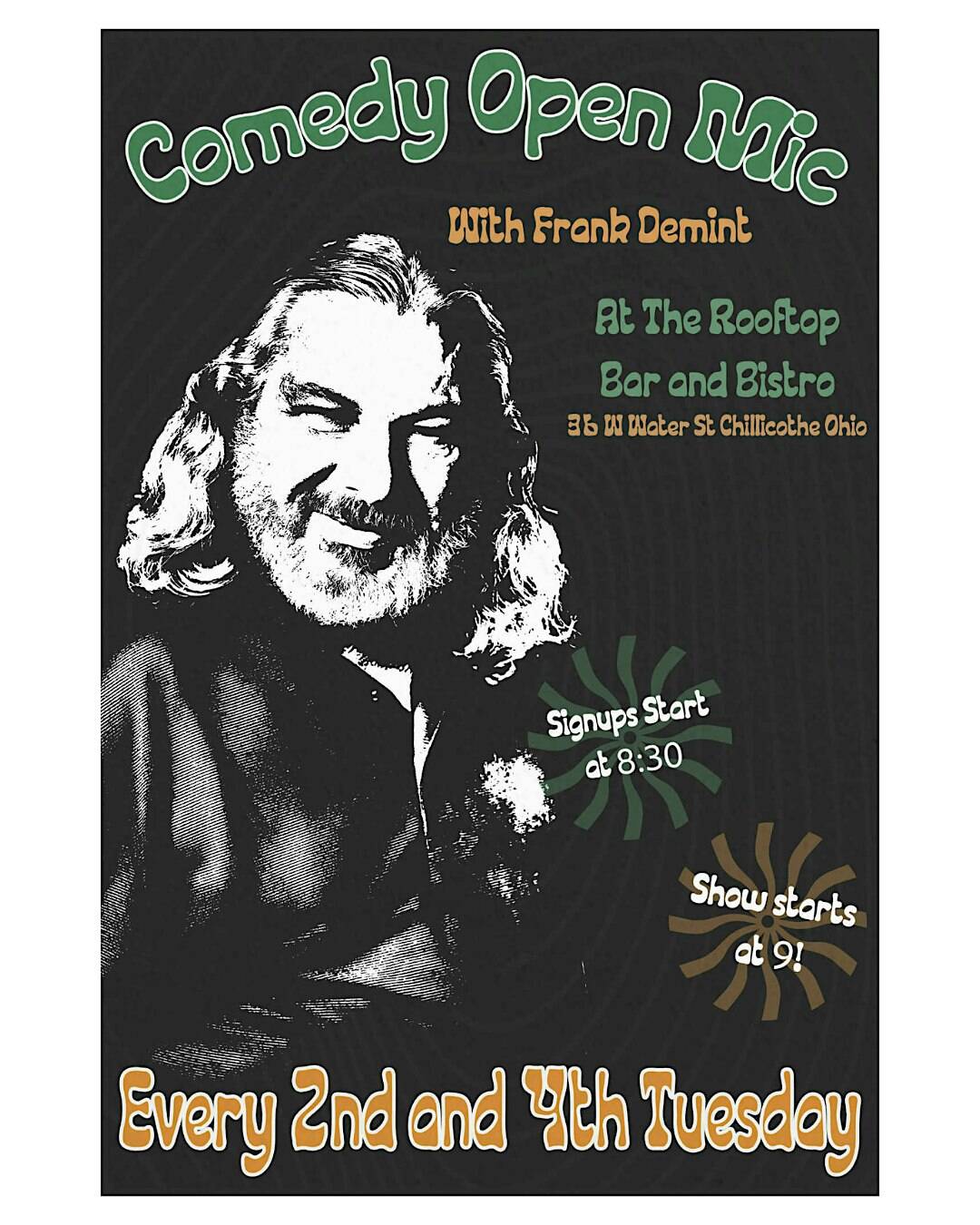 by admin14Feb The Rooftop Comedy Open Mic with Frank Demint and featuring Nick Taylor at The Rooftop Bar & Bistro – Chillicothe, OH The Rooftop Comedy Open Mic with Frank Demint and featuring Nick Taylor at The Rooftop Bar & Bistro – Chillicothe, OH 2 2 people viewed this event. Laugh out loud at The Rooftop Comedy Open Mic hosted by Frank Demint and featuring the hilarious Nick Taylor—live and in person! Tickets-RSVP Link Date And Time Wednesday, February 25th, 2026 01:00 AM (PST) Venue The Rooftop Bar & Bistro Location 36 West Water Street, Chillicothe, OH 45601 Event Types Concert or PerformancePerforming & Visual Arts Event Category Ohio Share With Friends Facebook Twitter Linkedin Xing Pinterest Share This Post: