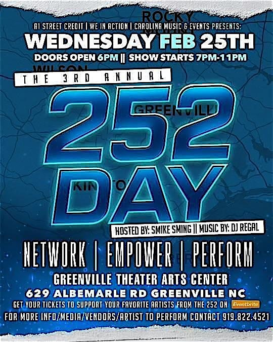 by admin13Feb 252 Day at Greenville Theatre Arts Center – Greenville, NC 252 Day at Greenville Theatre Arts Center – Greenville, NC 2 2 people viewed this event. Showcasing talent in the 252 area code Tickets-RSVP Link Date And Time Thursday, February 26th, 2026 12:00 AM (PST) Venue Greenville Theatre Arts Center Location 629 Albemarle Avenue, Greenville, NC 27834 Event Types Concert or PerformanceMusic Event Category North Carolina Share With Friends Facebook Twitter Linkedin Xing Pinterest Share This Post: