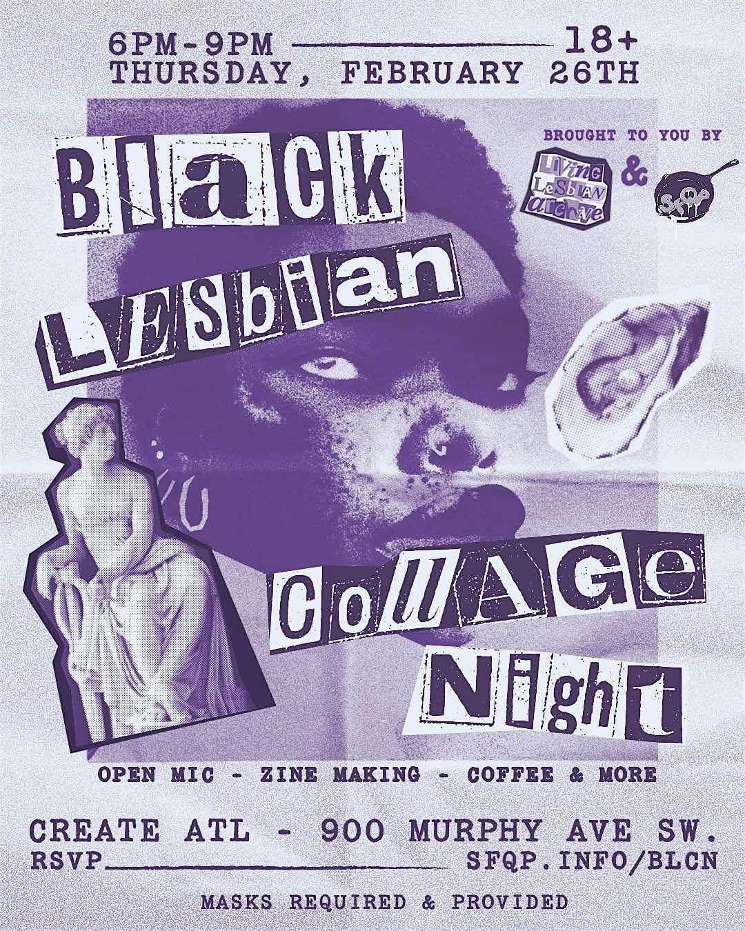 by admin14Feb Black Lesbian Collage Night: Open Mic & Zine Making at CreateATL – Atlanta, GA Black Lesbian Collage Night: Open Mic & Zine Making at CreateATL – Atlanta, GA 2 2 people viewed this event. A night of collage work, zine making, and an open mic for Black lesbians & sapphic folks. Tickets-RSVP Link Date And Time Thursday, February 26th, 2026 11:00 PM (PST) Venue CreateATL Location 900 Murphy Avenue Southwest, Atlanta, GA 30310 Event Types Concert or PerformancePerforming & Visual Arts Event Category AtlantaGeorgia Share With Friends Facebook Twitter Linkedin Xing Pinterest Share This Post:
