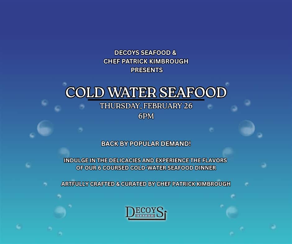 by admin14Feb COLD WATER SEAFOOD DINNER at Decoys Seafood – Suffolk, VA COLD WATER SEAFOOD DINNER at Decoys Seafood – Suffolk, VA 2 2 people viewed this event. Back by popular demand, Chef Patrick Kimbrough brings us his 6-course chef dinner, exploring the flavors & delicacies of cold-water seafood. Tickets-RSVP Link Date And Time Thursday, February 26th, 2026 11:00 PM (PST) Venue Decoys Seafood Location 3305 Ferry Road, Suffolk, VA 23435 Event Types Food & Drink Event Category Virginia Share With Friends Facebook Twitter Linkedin Xing Pinterest Share This Post: