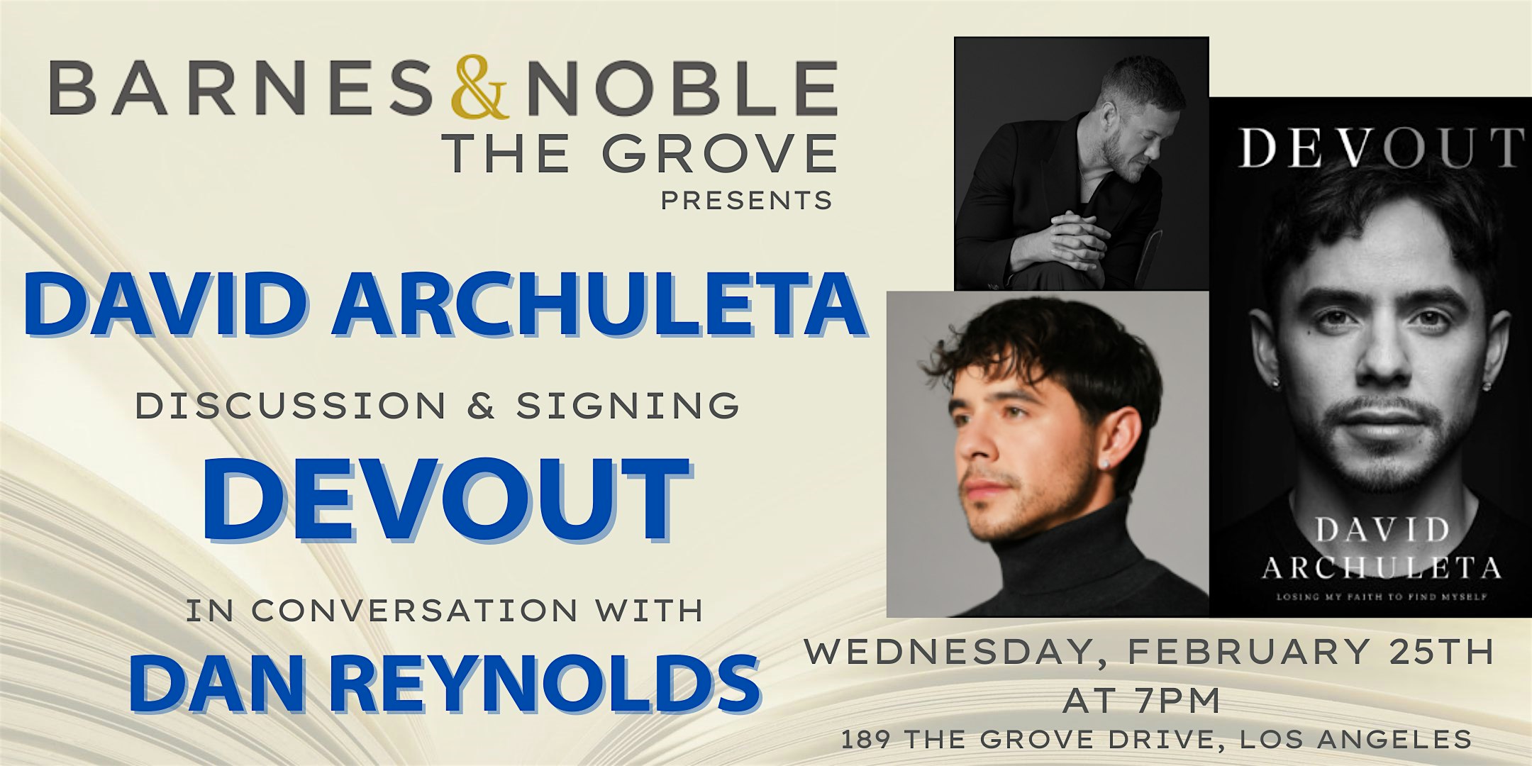 by admin13Feb David Archuleta signs DEVOUT at B&N The Grove at Barnes & Noble The Grove – Los Angeles, CA David Archuleta signs DEVOUT at B&N The Grove at Barnes & Noble The Grove – Los Angeles, CA 1 1 people viewed this event. Barnes & Noble The Grove welcomes David Archuleta to discuss and sign DEVOUT on February 25th at 7:00 PM! Tickets-RSVP Link Date And Time Thursday, February 26th, 2026 03:00 AM (PST) Venue Barnes & Noble The Grove Location 189 The Grove Drive, Los Angeles, CA 90036 Event Types Music Event Category CaliforniaLos Angeles Share With Friends Facebook Twitter Linkedin Xing Pinterest Share This Post: