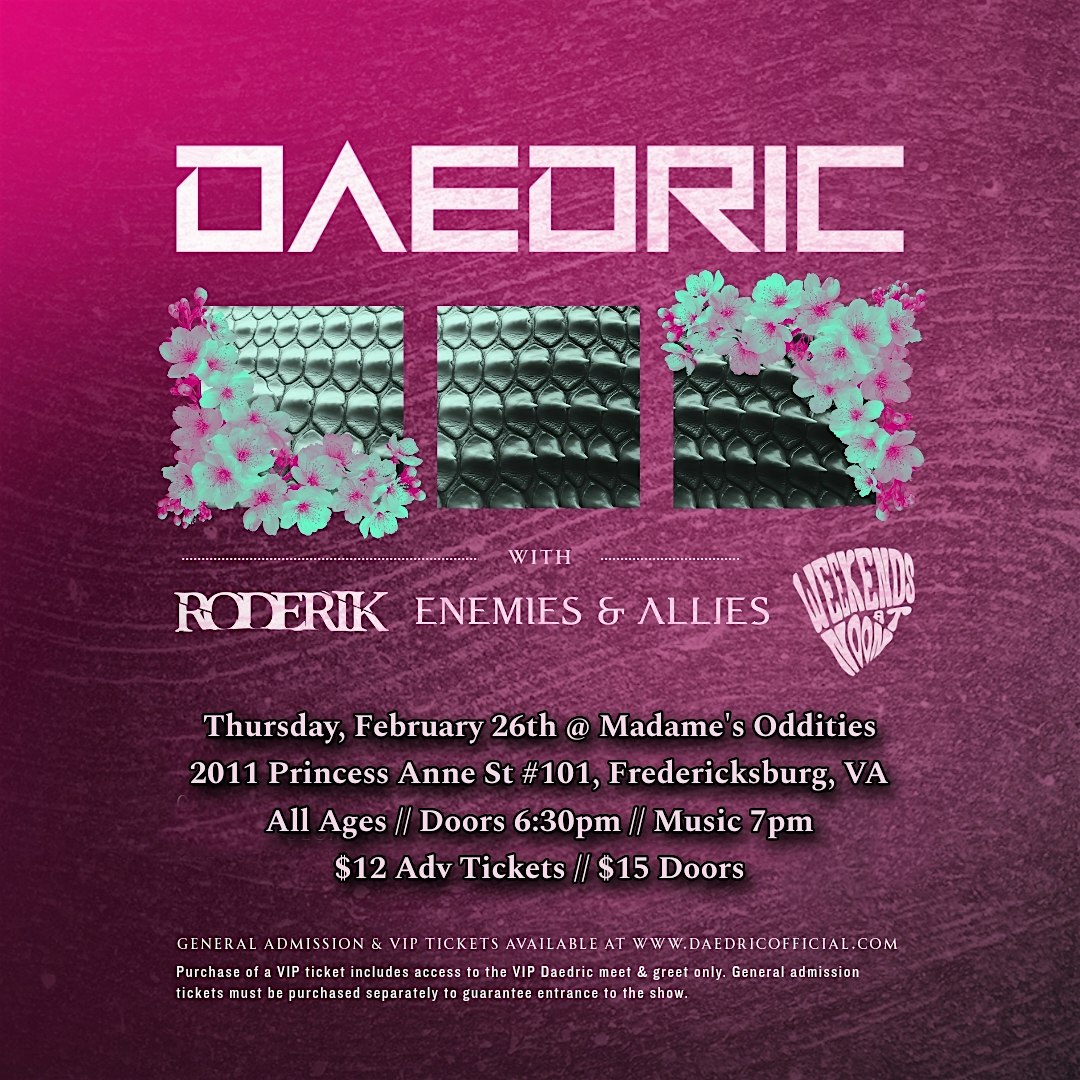by admin13Feb Deadric w/ Roderik, Enemies & Allies, Weekend At Noon @ Madames Oddities at Madame’s Oddities – Fredericksburg, VA Deadric w/ Roderik, Enemies & Allies, Weekend At Noon @ Madames Oddities at Madame’s Oddities – Fredericksburg, VA 1 1 people viewed this event. Deadric live at Madames Oddities w/ support from Roderik Enemies & Allies Weekend at Noon Tickets-RSVP Link Date And Time Thursday, February 26th, 2026 11:00 PM (PST) Venue Madame’s Oddities Location 2011 Princess Anne Street, Fredericksburg, VA 22401 Event Types Concert or PerformanceMusic Event Category Virginia Share With Friends Facebook Twitter Linkedin Xing Pinterest Share This Post: